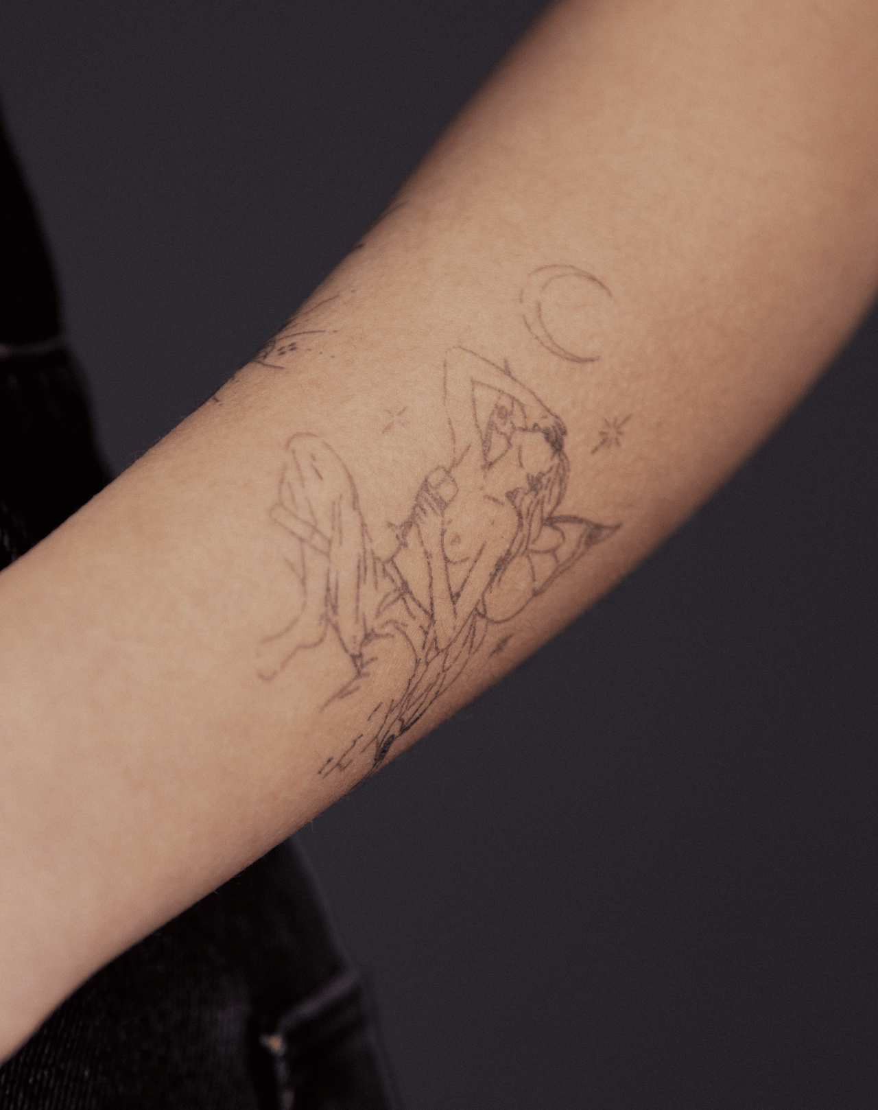 Angels Toast is a 3x6 inch design by @swink.ink that captures a whimsical moment of celestial rebellion. A carefree fairy lounges with one leg draped, wine glass in hand, basking under a crescent moon and twinkling stars. Her wings curl playfully behind her as she throws her head back in laughter or longing. It's a celebration of self-indulgence, freedom, and the beauty of feeling everything. Delivered as a 1–2 week EZINK temporary tattoo for those who toast to the night and sip from the surreal.