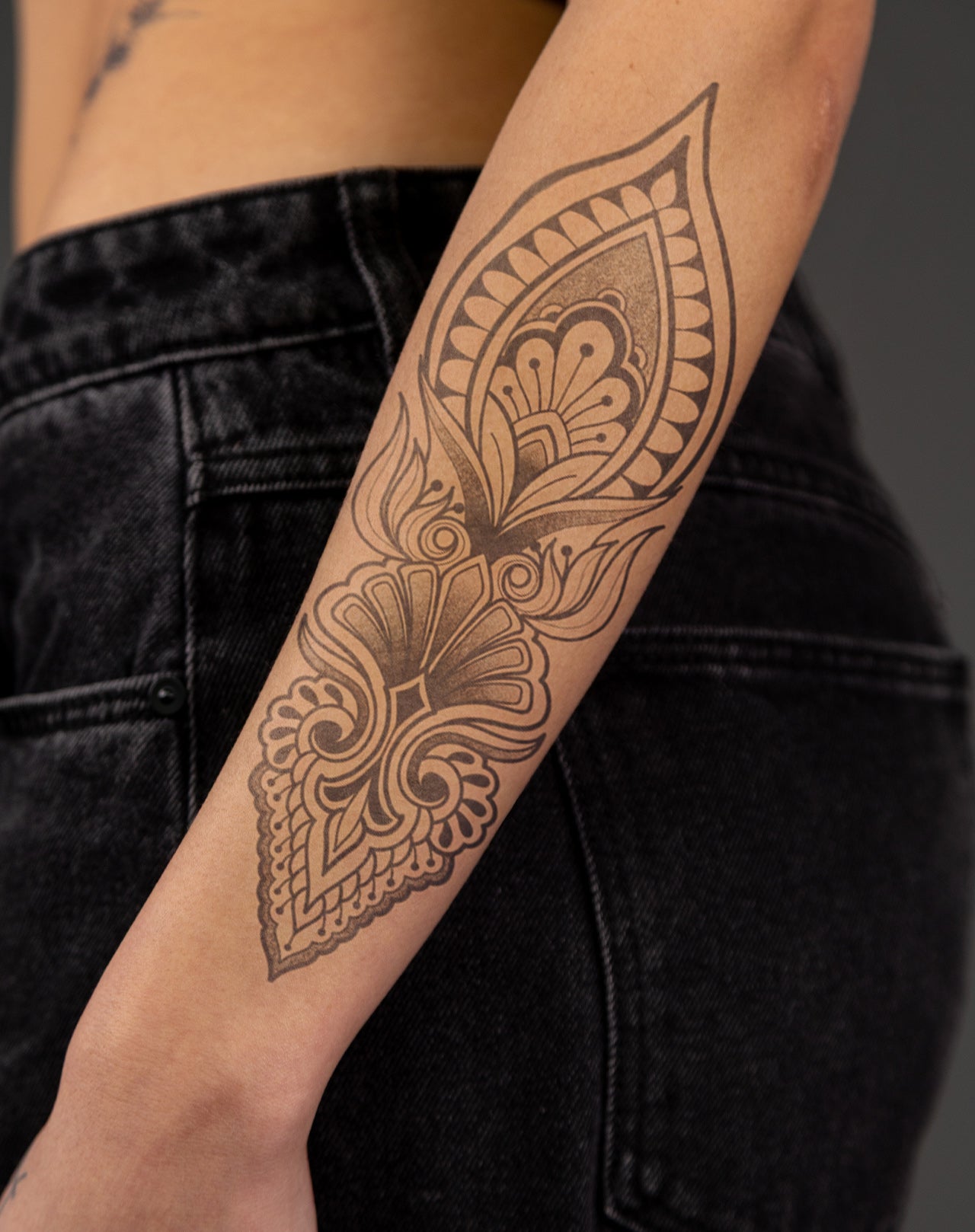 Balanced Soul is a harmonious 5.5 x 9 inch design featuring an intricate mandala with ornamental layering and fine dotwork shading, echoing sacred patterns and symmetrical flow. Created by @lil_skiins, this EZINK temporary tattoo lasts 1–2 weeks, inviting stillness, balance, and a connection to inner clarity through ornamental elegance.