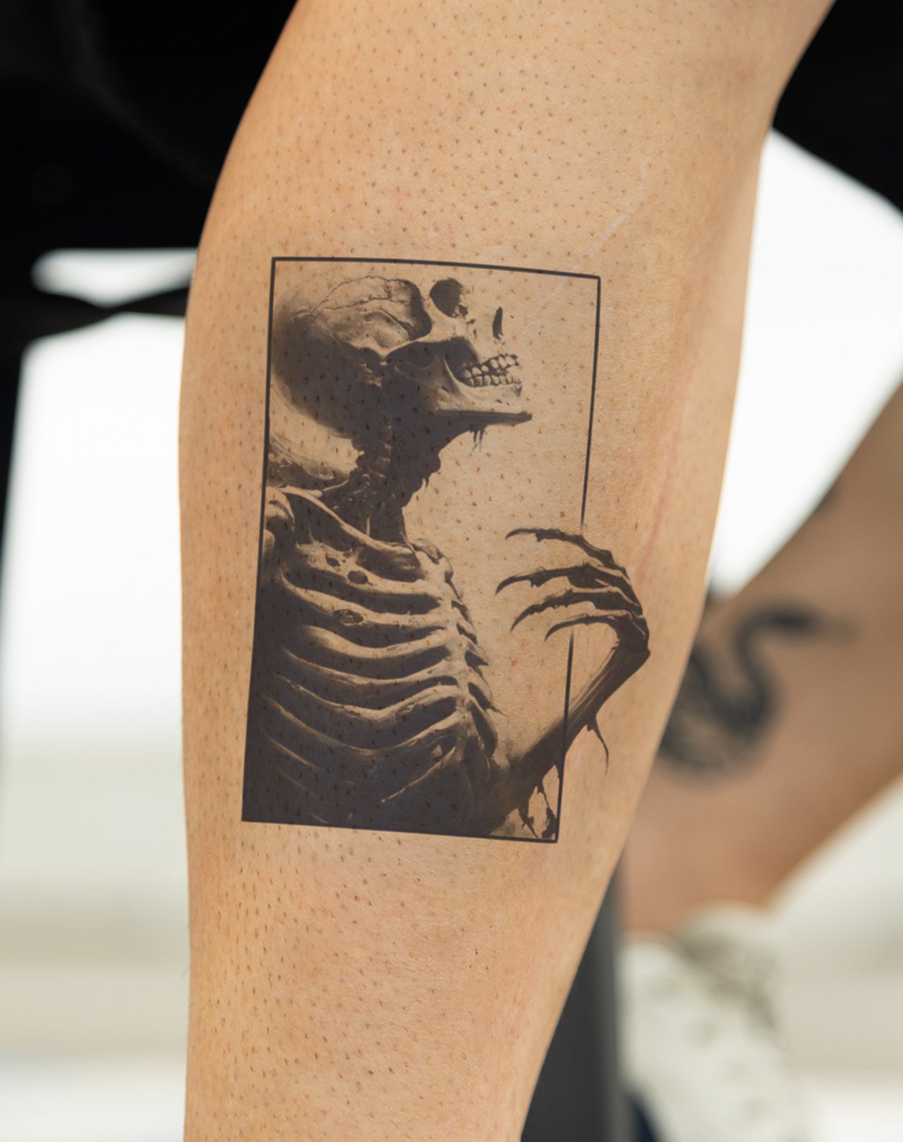 Between Realms is a 4x7 inch design by @mitchgtatts that captures a haunting moment suspended between life and death. A skeletal figure emerges from the darkness, clawed hand raised as if breaching a veil that separates existence from the unknown. Framed in stark contrast and eerie realism, this piece embodies transcendence, mortality, and the surreal. Delivered as a 1–2 week EZINK temporary tattoo.