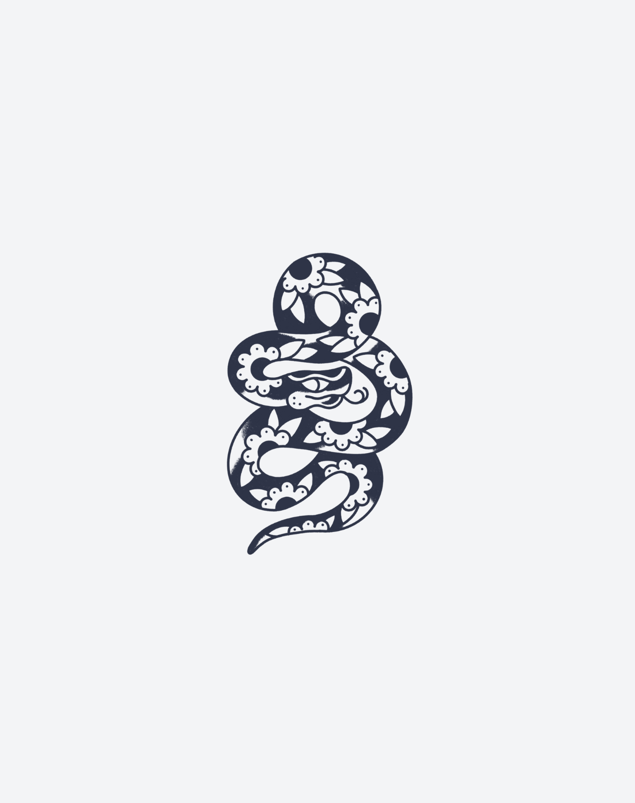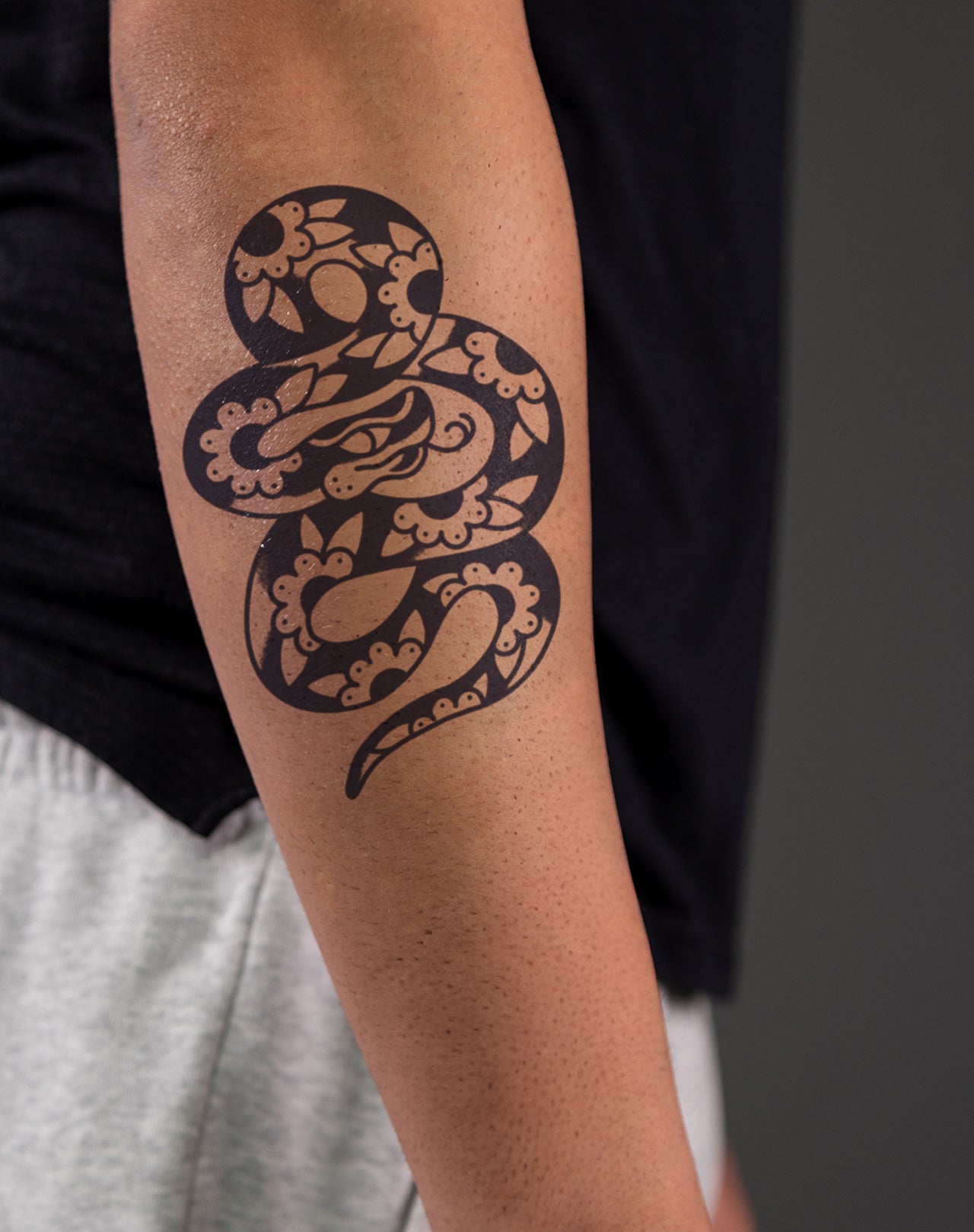 Botanic Bite is a 3x6 inch design by @emmypokes that fuses classic tattoo boldness with organic grace. A coiled serpent winds through a pattern of leaves and petals, its poised form both protective and alive with motion. The dark, floral detailing pays homage to traditional tattoo linework—each petal and curve crafted with intention. A longstanding emblem of transformation, intuition, and rebirth, the snake here represents renewal through change, beauty through balance. This 1–2 week EZINK temporary tattoo’s flowing symmetry makes it ideal for placement along the arm, ribcage, or thigh—an emblem of growth that strikes with quiet confidence.