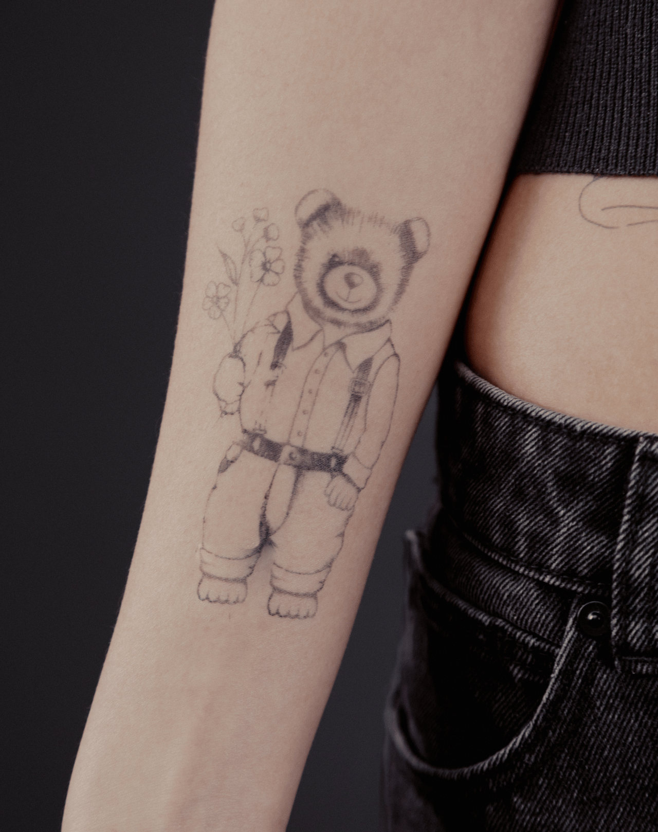 Buddy Bloom is a 3x6 inch design by @shelltatts featuring an endearing teddy bear dressed in suspenders and rolled-up trousers, holding a bouquet of wildflowers. Radiating gentle warmth and nostalgic charm, this tattoo is a perfect symbol of kindness and simple joys. Delivered as a 1–2 week EZINK temporary tattoo.