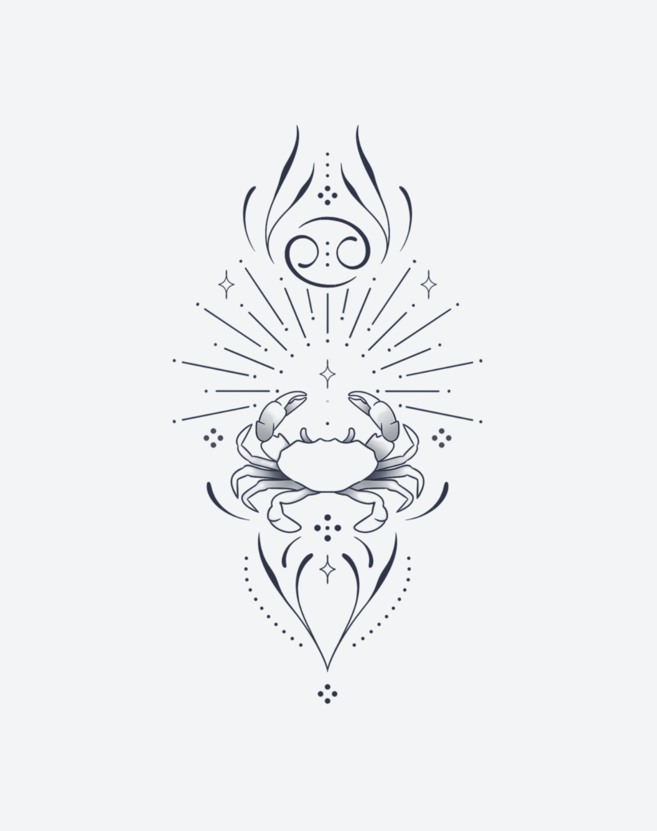 Cancers Calm is a 3x6 inch design by @sandra.o.tattoo, showcasing the serene yet protective spirit of the Cancer zodiac. At its core, a tranquil crab is depicted, symbolizing the nurturing and empathetic qualities of those born under this sign. The crab sits gracefully, surrounded by ethereal lines that evoke the calm flow of water, while celestial symbols such as moons and stars frame the design, hinting at Cancer’s deep connection to the emotional and intuitive realms. This tattoo reflects both the gentle strength and profound sensitivity of the Cancer personality, making it a perfect tribute for those whose hearts are as steady as the tides. Delivered as an EZINK temporary tattoo, it lasts 1-2 weeks, offering a brief yet powerful expression of inner peace.