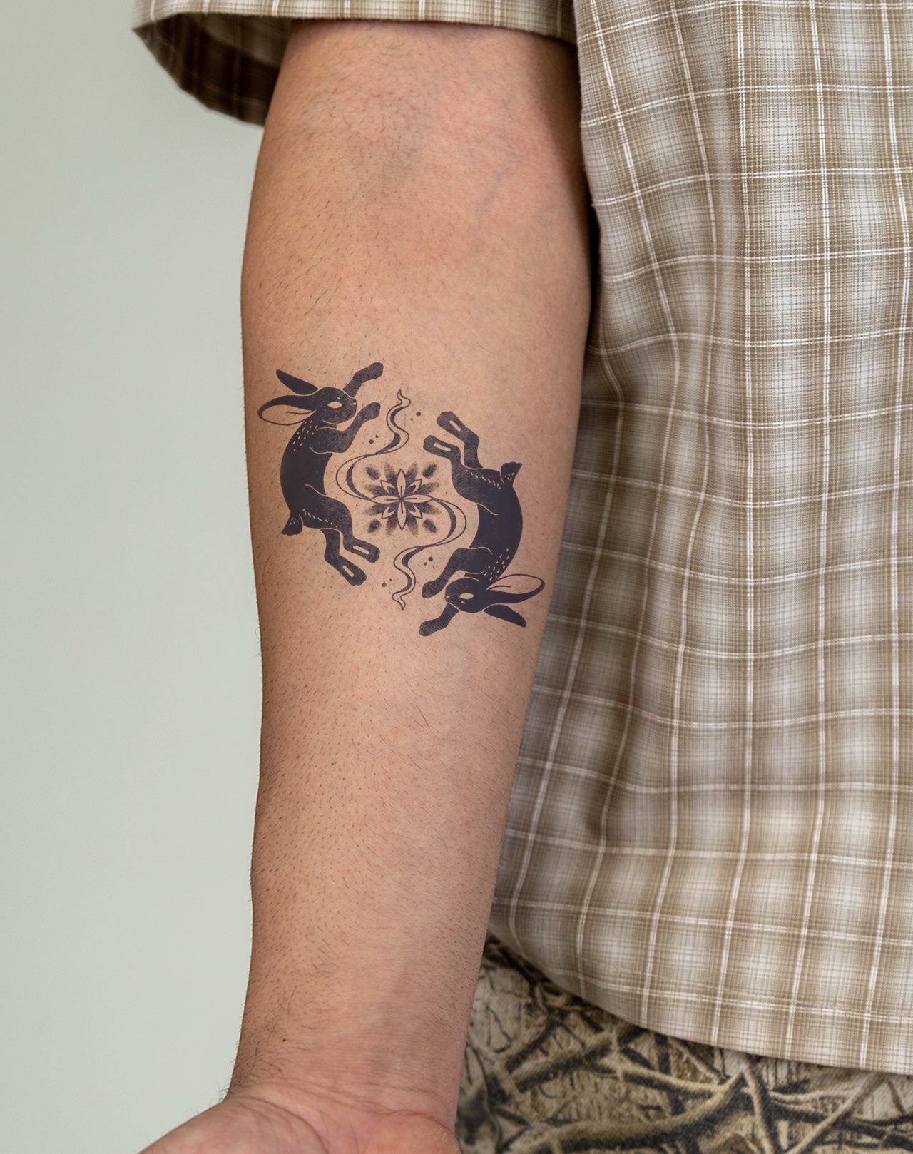 Indulge in the temporary beauty of Chasing Rabbits - the 4x4 inch EZINK tattoo designed by marcy.tattoo_. Featuring two playful rabbits chasing each other's tails, this tattoo is sure to delight and last 1-2 weeks. Get ready for compliments!