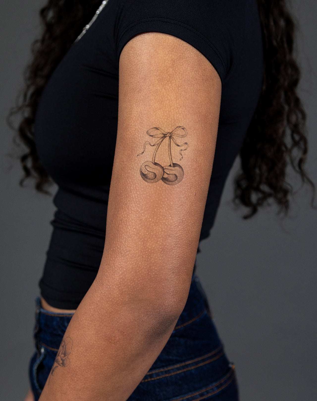 Cherry Tied is a 2x3 inch design by @brooketattoos, featuring a pair of glossy cherries delicately bound together with a flowing ribbon bow. Playful yet elegant, the design evokes sweetness, flirtation, and charm — a timeless symbol of youth, indulgence, and a hint of mischief. This 1–2 week EZINK temporary tattoo has clean shading and soft curves make it a versatile piece for bold statements or subtle accents.