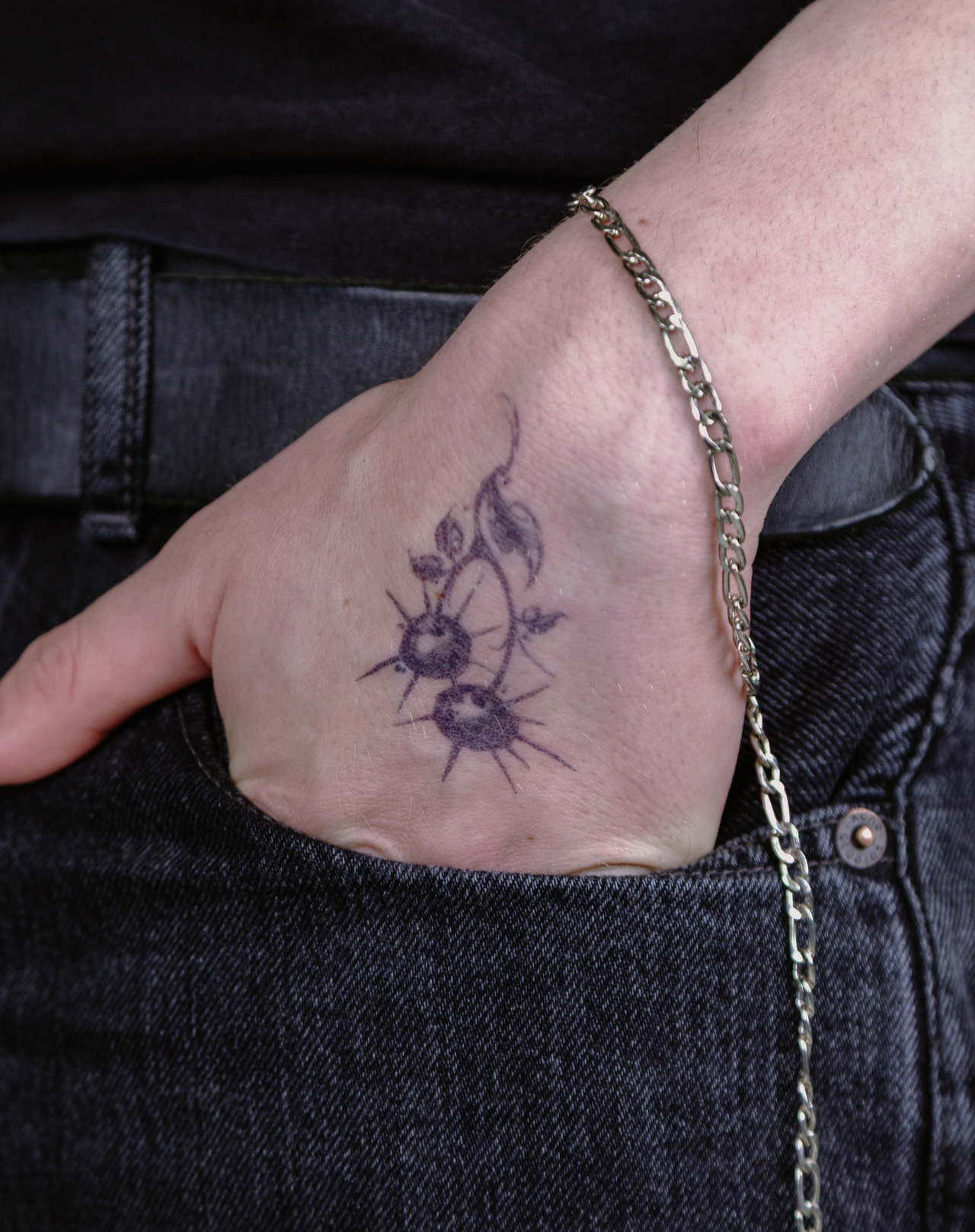 Cherrywick is a daring 2x3 inch design where botanical elegance meets gothic bite. Twin fruits dangle from curling stems—each orb encircled with sharp thorns and framed by moody leaves and inked accents. Created by @kirsten.tattoo, this EZINK temporary tattoo lasts 1–2 weeks, perfect for those drawn to dark beauty, duality, and sweetness with a sting.