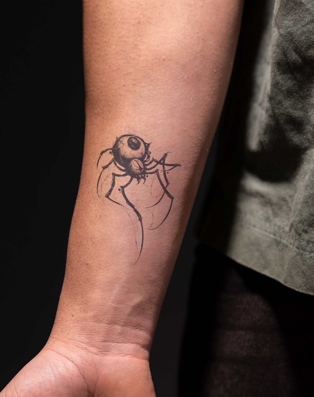 Creeping Eye is a chilling 4x4 inch design that fuses horror and surrealism in one unforgettable form. A spider-like creature crawls forward—its bulbous body replaced by a single unblinking eye, surrounded by jagged limbs and inky shadows. Created by @kirsten.tattoo, this EZINK temporary tattoo lasts 1–2 weeks, perfect for those who walk the edge, watch the unseen, and wear fear like armor.