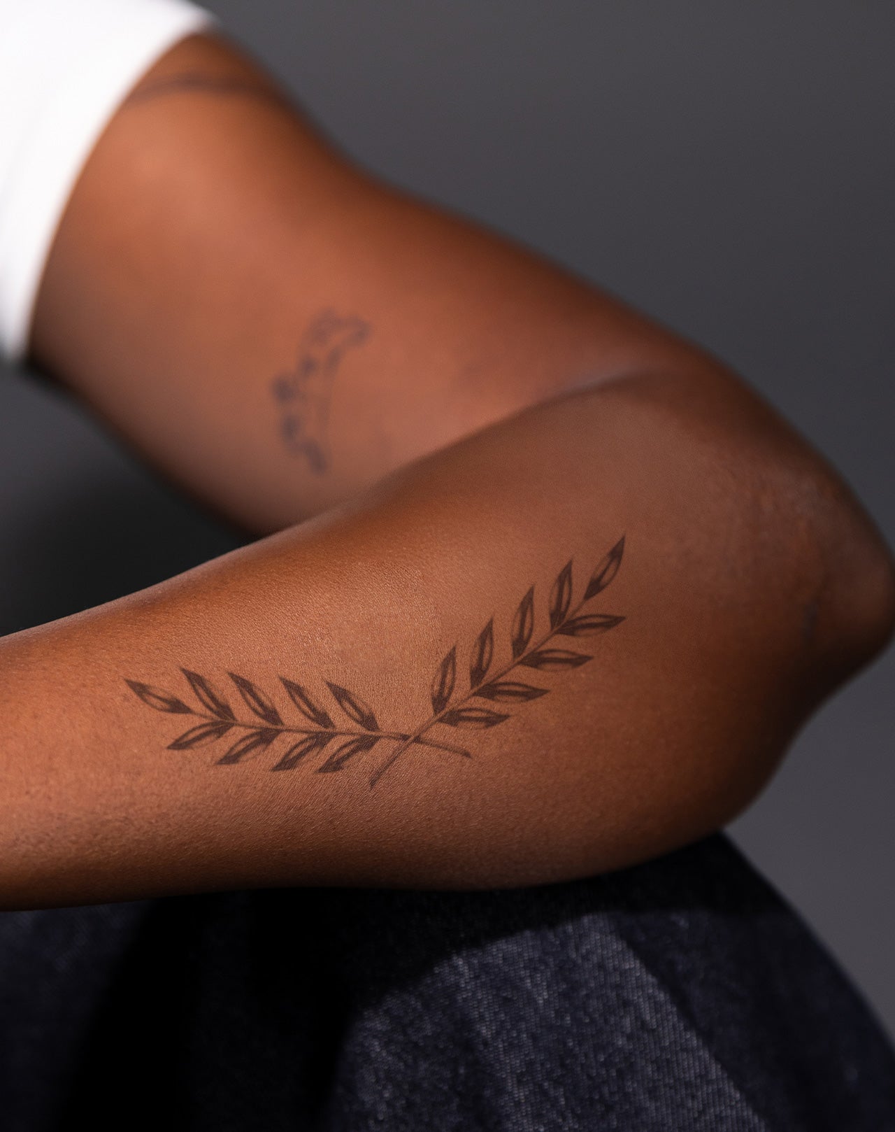 Crossed Stem is a 3x6 inch design by @brooketattoos, featuring two delicate branches that cross at the base and arc outward in perfect symmetry. Inspired by the timeless laurel wreath, this piece symbolizes victory, honor, and resilience. With its refined shading and elegant balance, this 1–2 week EZINK temporary tattoo is a versatile design that carries both classic beauty and powerful meaning.