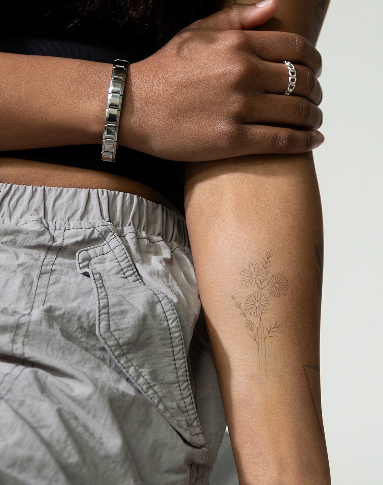 Daisy Bunch is a 2x4 inch design by @brooketattoos, featuring a small hand-drawn cluster of daisies and wild sprigs. Minimal and graceful, the design evokes purity, hope, and the simple joys found in nature. Its clean lines and airy composition make it a versatile piece — This 1–2 week EZINK temporary tattoo is perfect as a subtle emblem of renewal and light-hearted beauty.