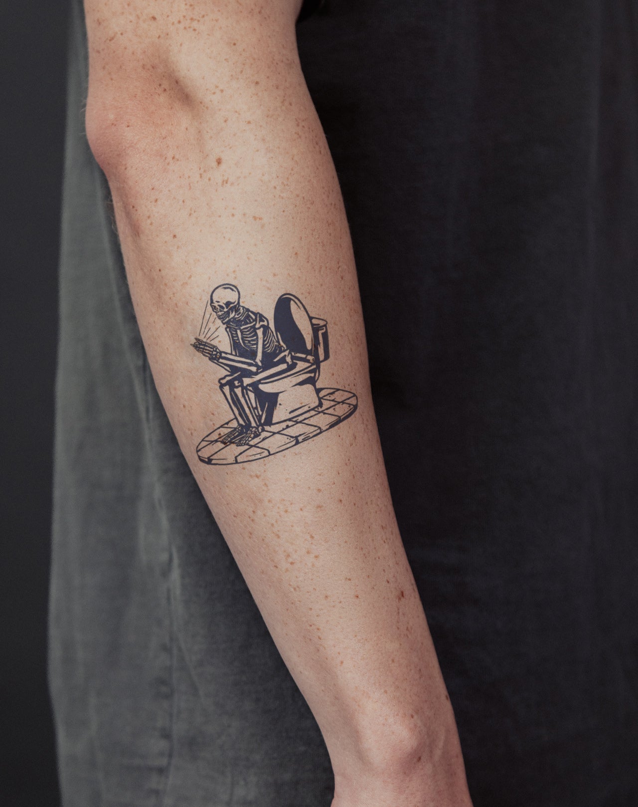 Death’s Break is a darkly humorous 4x4 inch design featuring a skeleton casually sitting on the toilet, scrolling through its phone—a moment of death in the most mundane setting. Created by @vladbaut, this EZINK temporary tattoo lasts 1-2 weeks, perfect for those who find irony in even the most unexpected places. Because even death needs a break.