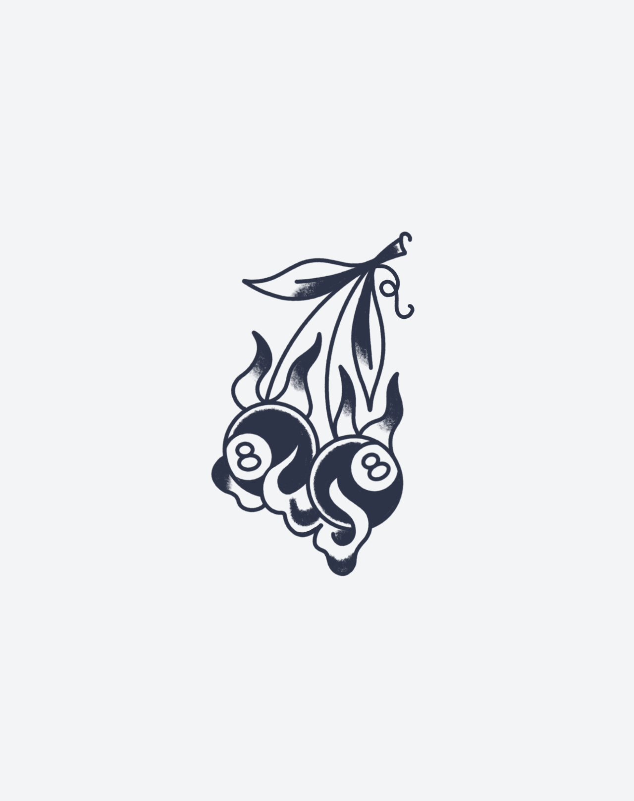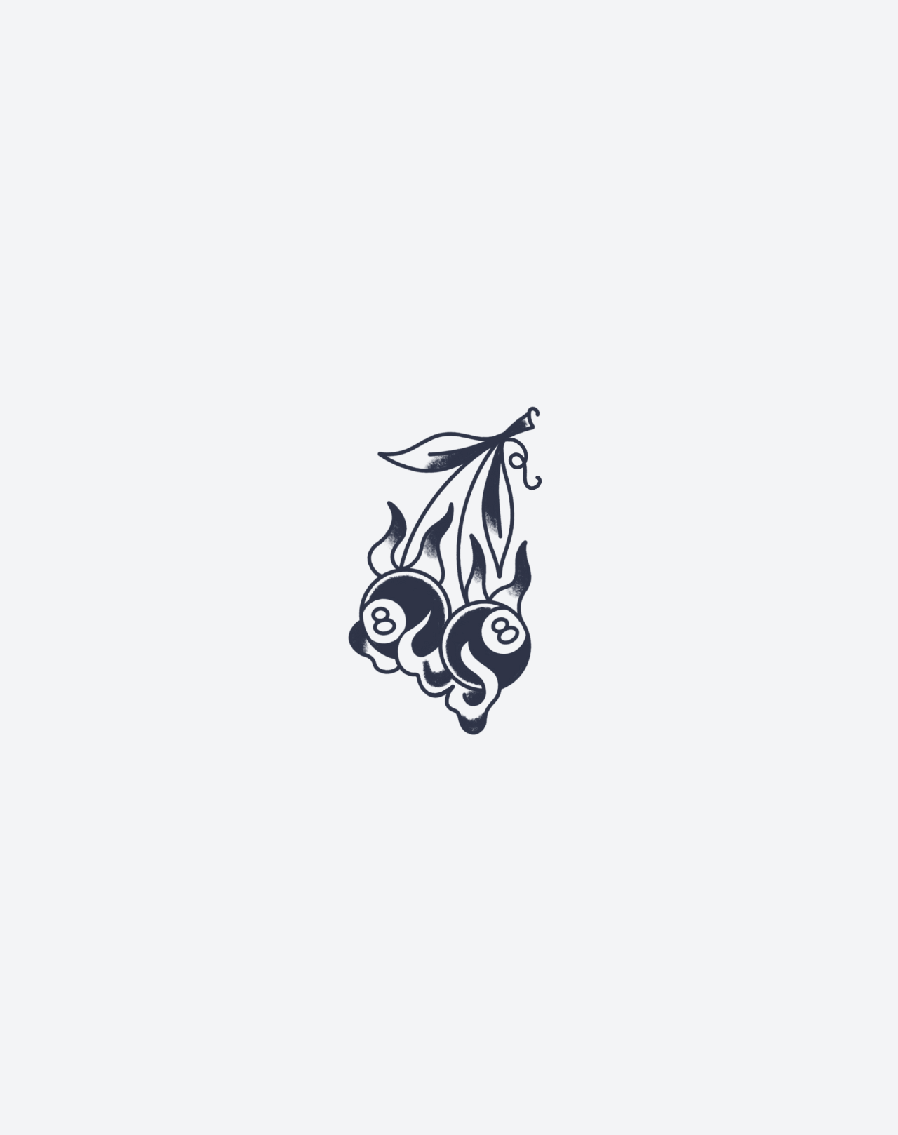 Double8 is a 2x3 inch design by @emmypokes that turns luck into legend. Twin eight balls hang like fruit on a vine, their flames and leaves drawn in the bold, timeless lines of classic flash art. The design’s balance of symmetry and motion gives it a sense of playful defiance—a charm for those who make their own fortune. Long tied to risk, fate, and rebellion, the number eight here becomes a symbol of infinite possibility. This 1–2 week EZINK temporary tattoo sits perfectly on the bicep, calf, or forearm—an emblem for those who live on instinct, trusting the spin of their own destiny.