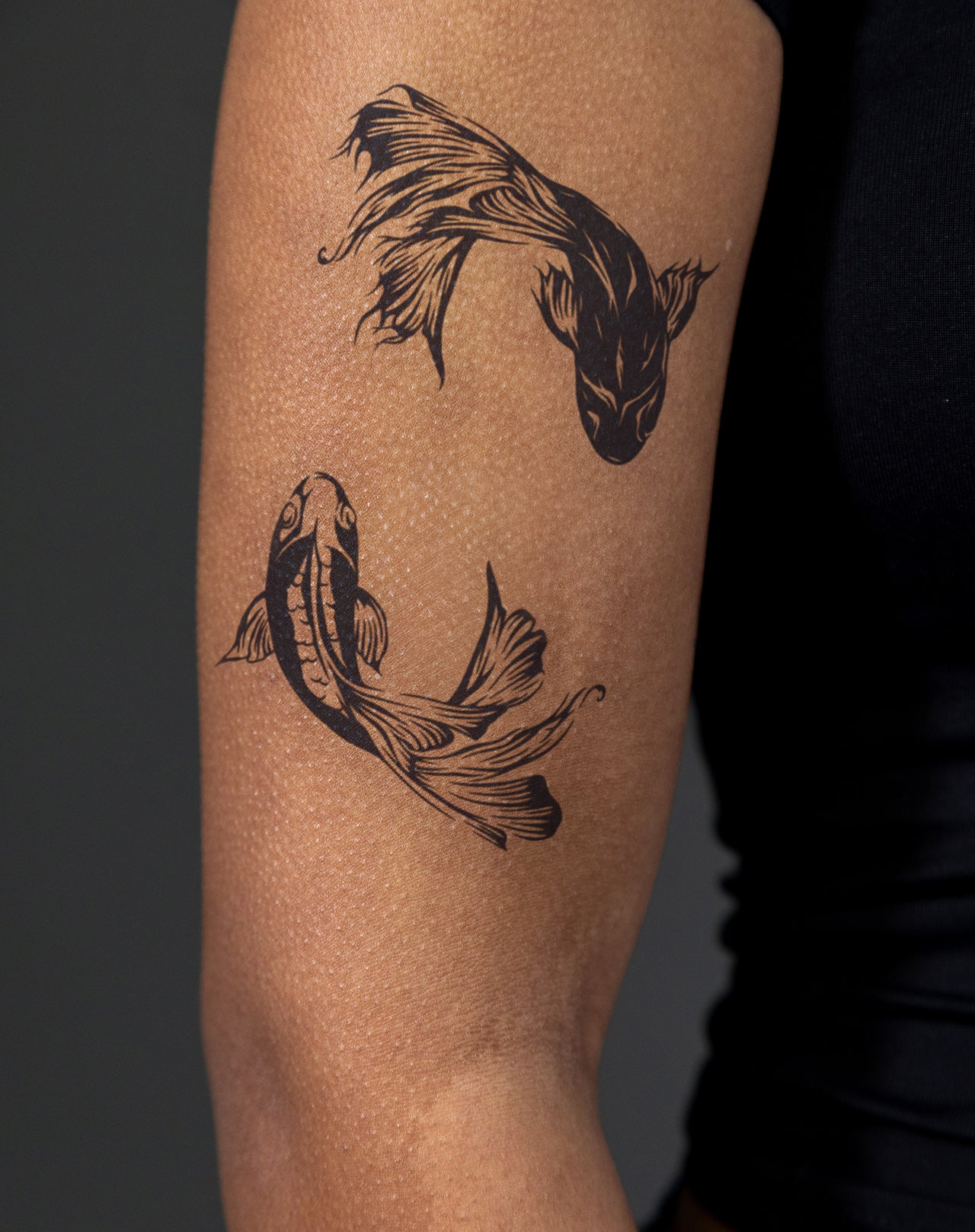 Boost your energy and flow with our 4x7 inch EZINK temporary tattoo by mahlo_tattoo. Featuring a stunning design of two koi fishes circling each other, this tattoo lasts 1-2 weeks, giving you a constant reminder of the power of movement and balance. Feel energized and inspired with every glance!