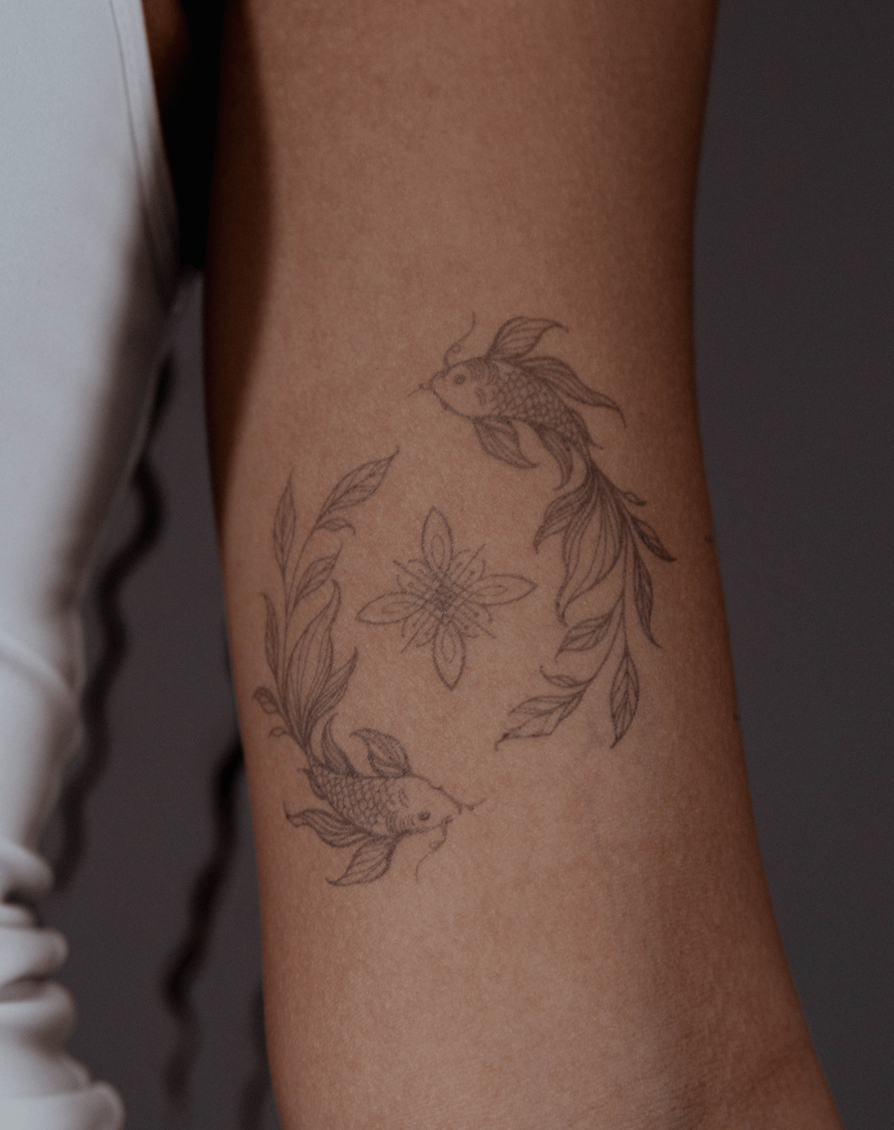 Eternal Current is a 4x4 inch design by @caitlynjtattoo that features two gracefully flowing koi fish surrounded by intricate leaves and a delicate floral motif. This symmetrical composition represents balance, transformation, and the endless flow of life. Perfect for those drawn to the serenity of nature and the symbolism of the koi fish, it’s an elegant and meaningful choice. Delivered as a 1–2 week EZINK temporary tattoo.