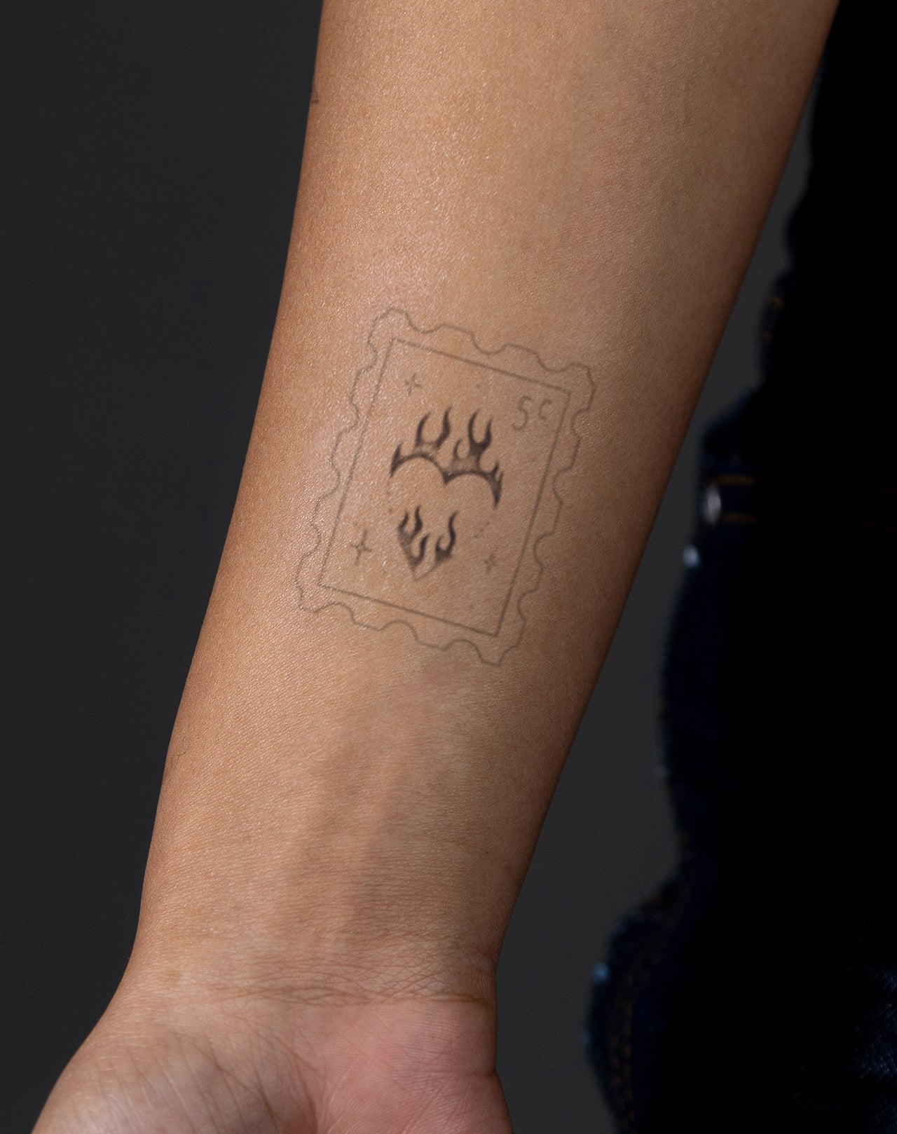 Flame Mail is a 2x3 inch design by @brooketattoos, featuring a bold heart engulfed in flames, framed within the outline of a vintage postage stamp. Accented with stars and a “5¢” detail, the piece blends nostalgia with passion, as if sending a letter sealed in fire. This 1–2 week EZINK temporary tattoo symbolizes love that transcends distance, intensity that can’t be contained, and the timeless act of wearing your heart proudly.