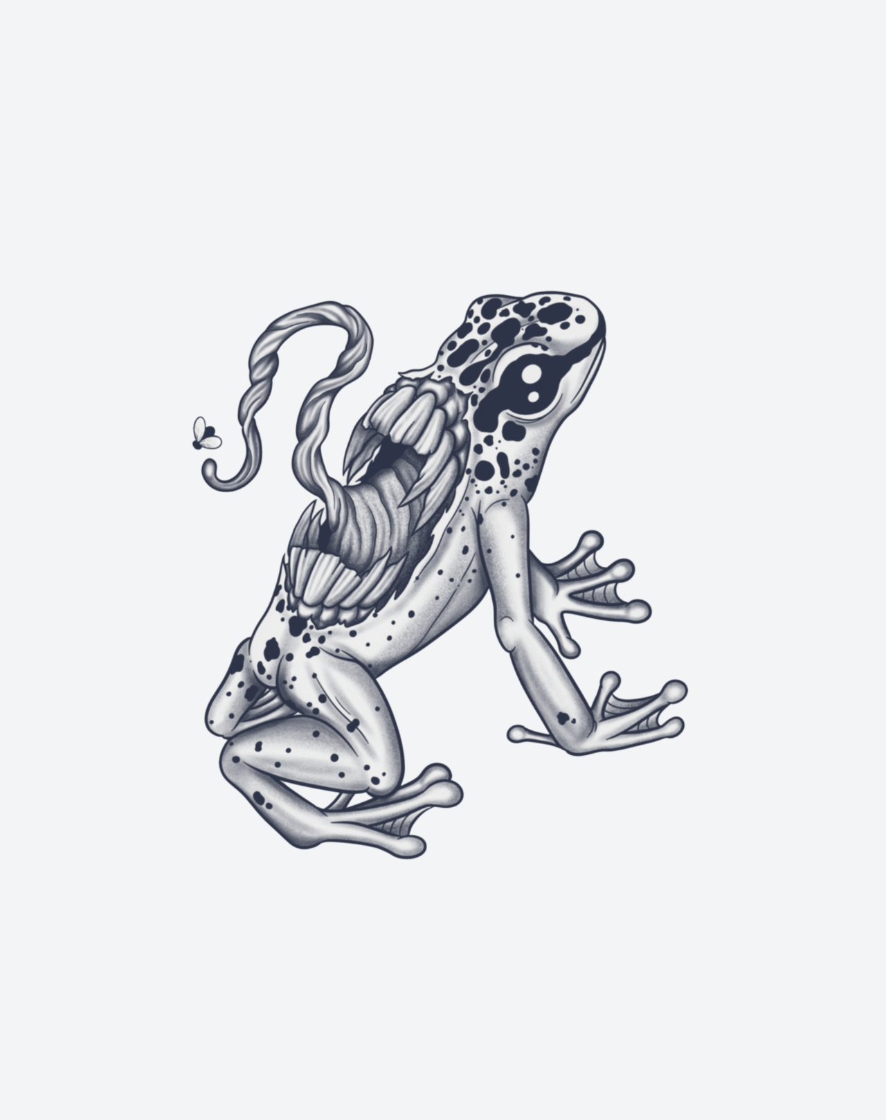 Flesh & Flora is a 4x4 inch design by @sophielutticktattoos that merges the beauty of nature with the surreal. This detailed piece features a dart frog mid-leap, with its body peeling away to reveal flowing petals where muscle should be—a botanical twist on anatomy that blurs the line between decay and bloom. With bold shading and whimsical details (like the tiny fly companion), it's a striking choice for lovers of the strange and the natural alike. EZINK temporary tattoos lasts 1–2 weeks.