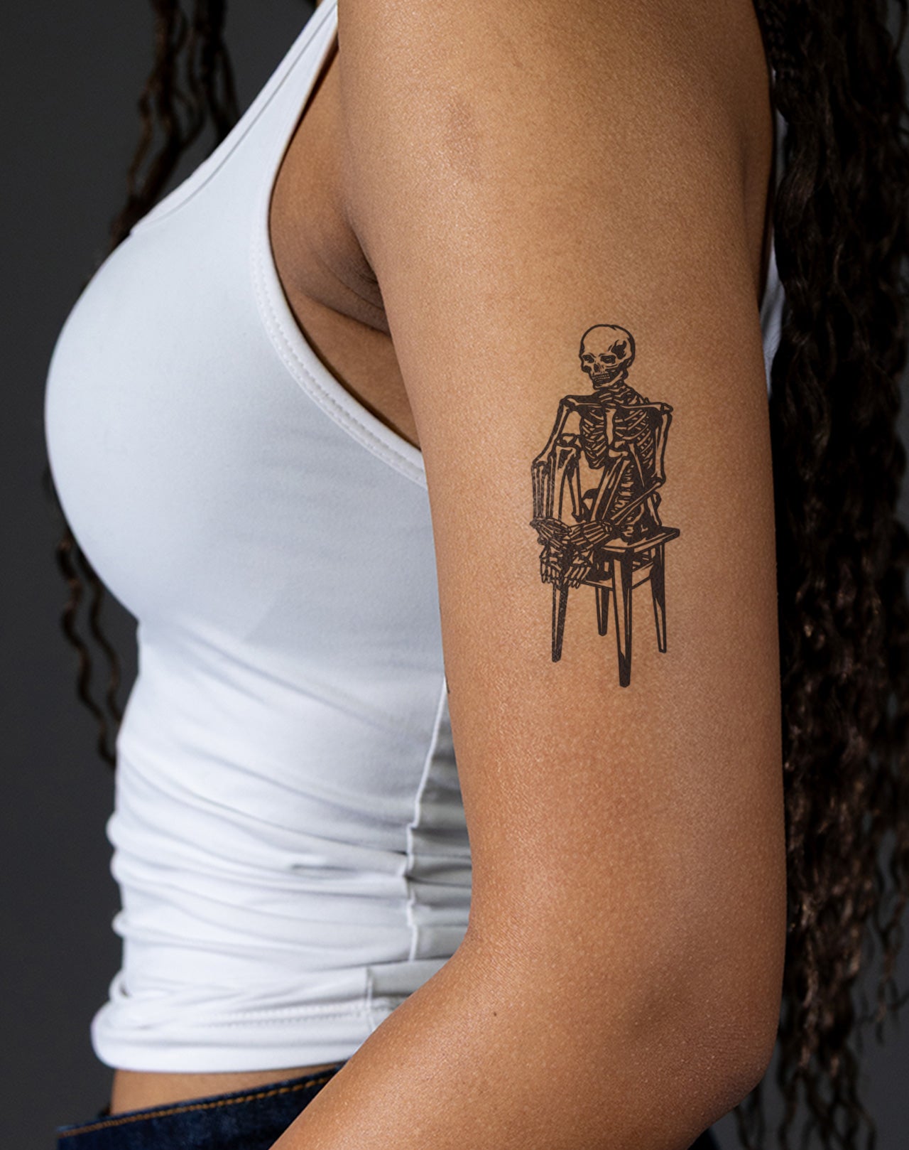 Grim Pause is a chilling 2x4 inch design featuring a skeleton sitting motionless in a chair, embodying a moment frozen in time. Created by @vladbaut, this EZINK temporary tattoo lasts 1-2 weeks, perfect for those who embrace the eerie stillness that comes before the inevitable. A reminder that even in stillness, death lingers.