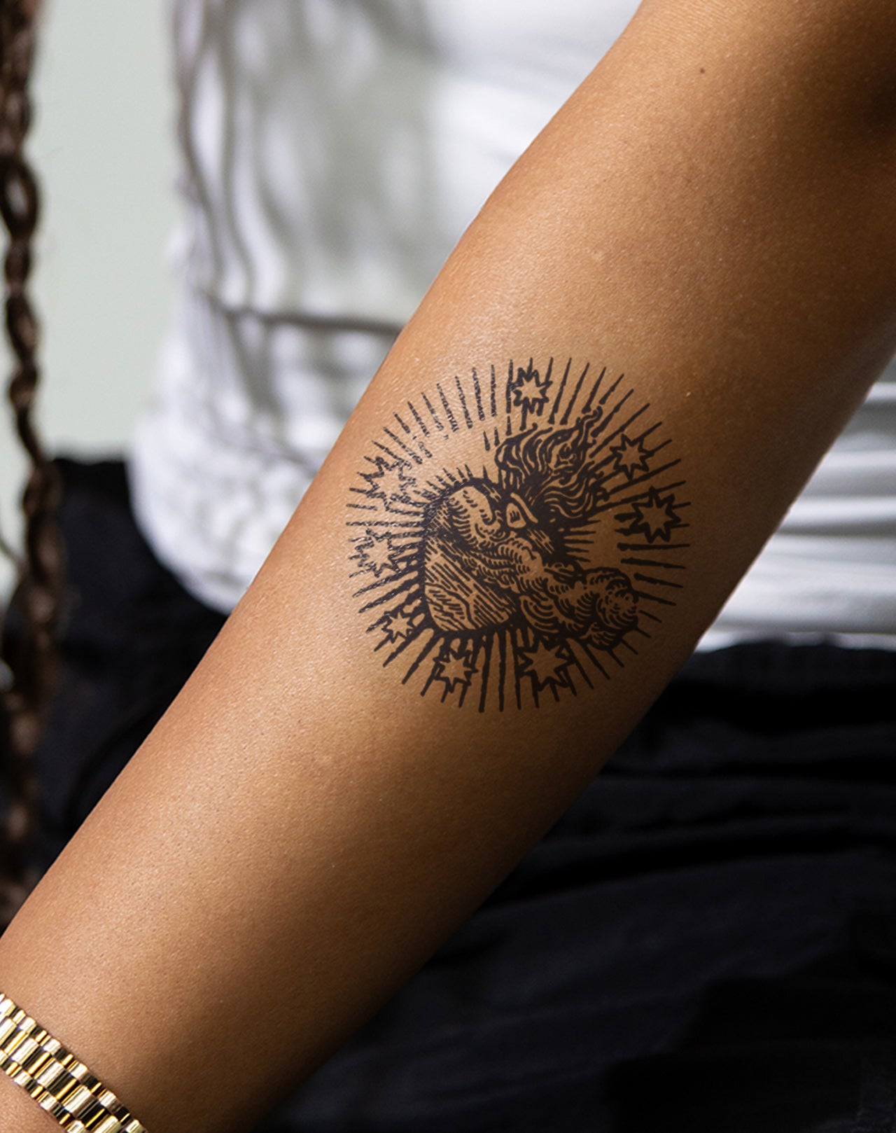 Carry a symbol of resilience and faith with Guiding Grace, a 4x4 inch EZINK temporary tattoo by @in.grave.tattoo. Featuring a sacred heart encircled by stars, this design embodies strength, devotion, and the light that leads through the dark. Lasting 1-2 weeks, it's perfect for those who wear their spirit like armor.