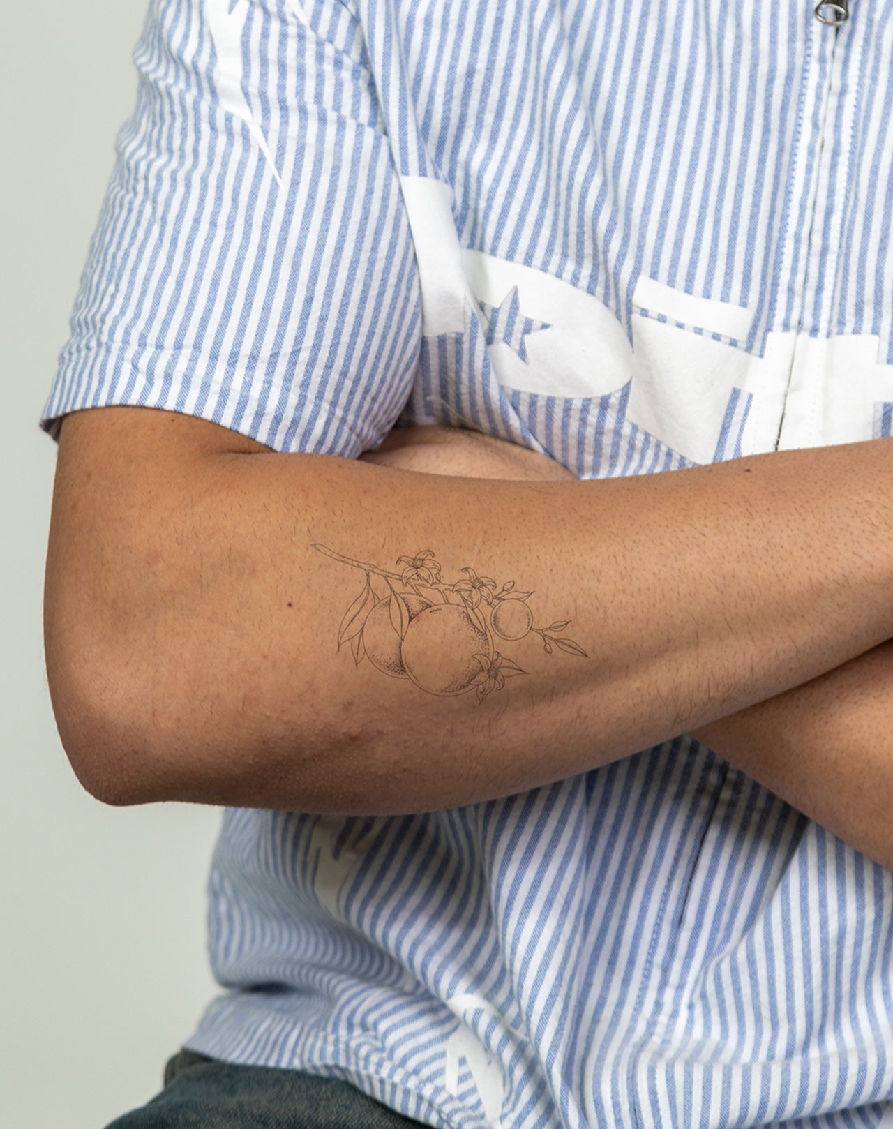 Harvest is a 2x3 inch design by @brooketattoos, depicting a delicate sprig of oranges in fine botanical detail. With graceful leaves and blossoms framing the ripe fruit, the design evokes abundance, vitality, and the sweetness of life’s simple pleasures. Minimal yet lush, this1–2 week EZINK temporary tattoo is a timeless emblem for growth, nourishment, and the cycles of nature.