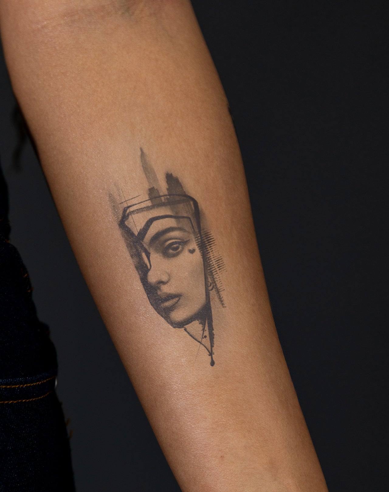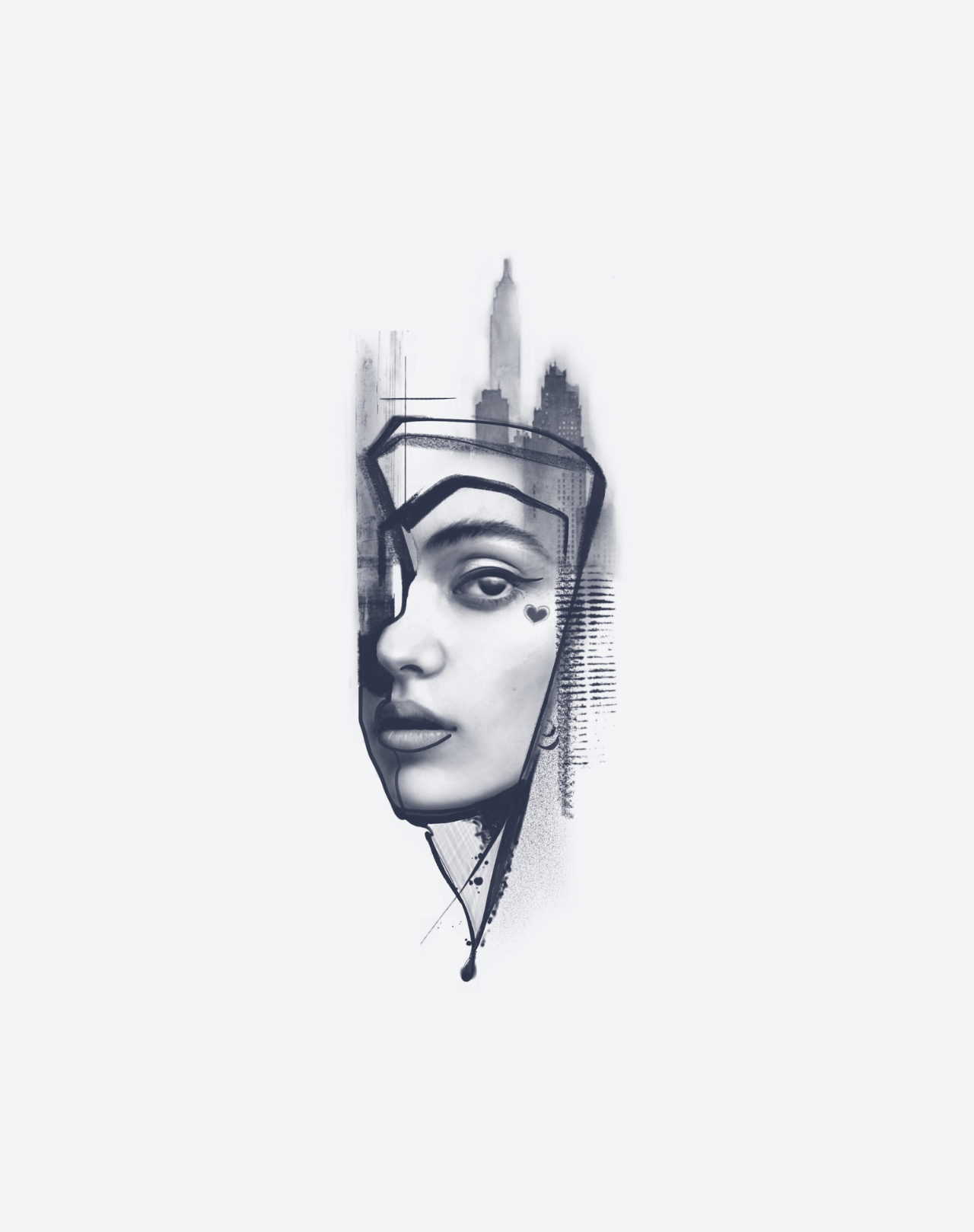 Heart of Concrete is a 2x4 inch design by @maya.tatt, blending human tenderness with the geometry of the urban dreamscape. A woman’s gaze emerges from the city skyline—soft yet unyielding—her expression framed by angular lines and smudges of architectural decay. The heart beneath her eye becomes both symbol and scar, an emblem of love surviving within the machinery of modern life. This design bridges realism and abstraction, emotion and structure, echoing the resilience of identity in a world that reshapes us. This 1–2 week EZINK temporary tattoo finds harmony on the arm, shoulder, or spine—a striking testament to strength, solitude, and self-construction.