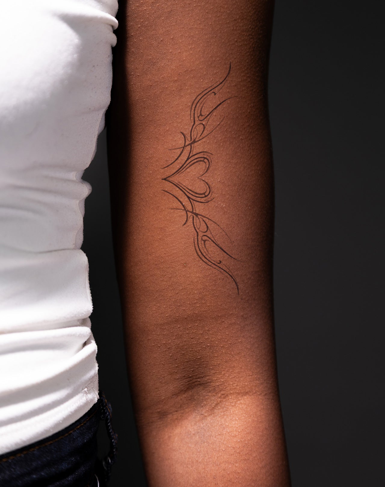 Heart Spread is a 3x6 inch design by @lorrainy.tatts that fuses bold tribal energy with tender symbolism. At its core, a heart anchors the piece, extending into fluid, flame-like curves that radiate outward in perfect symmetry. The lines balance sharp strength with graceful movement, creating a visual echo of wings unfurling or fire spreading—both fierce and tender. This 1–2 week EZINK temporary tattoo embodies passion, protection, and the unstoppable momentum of love in motion.