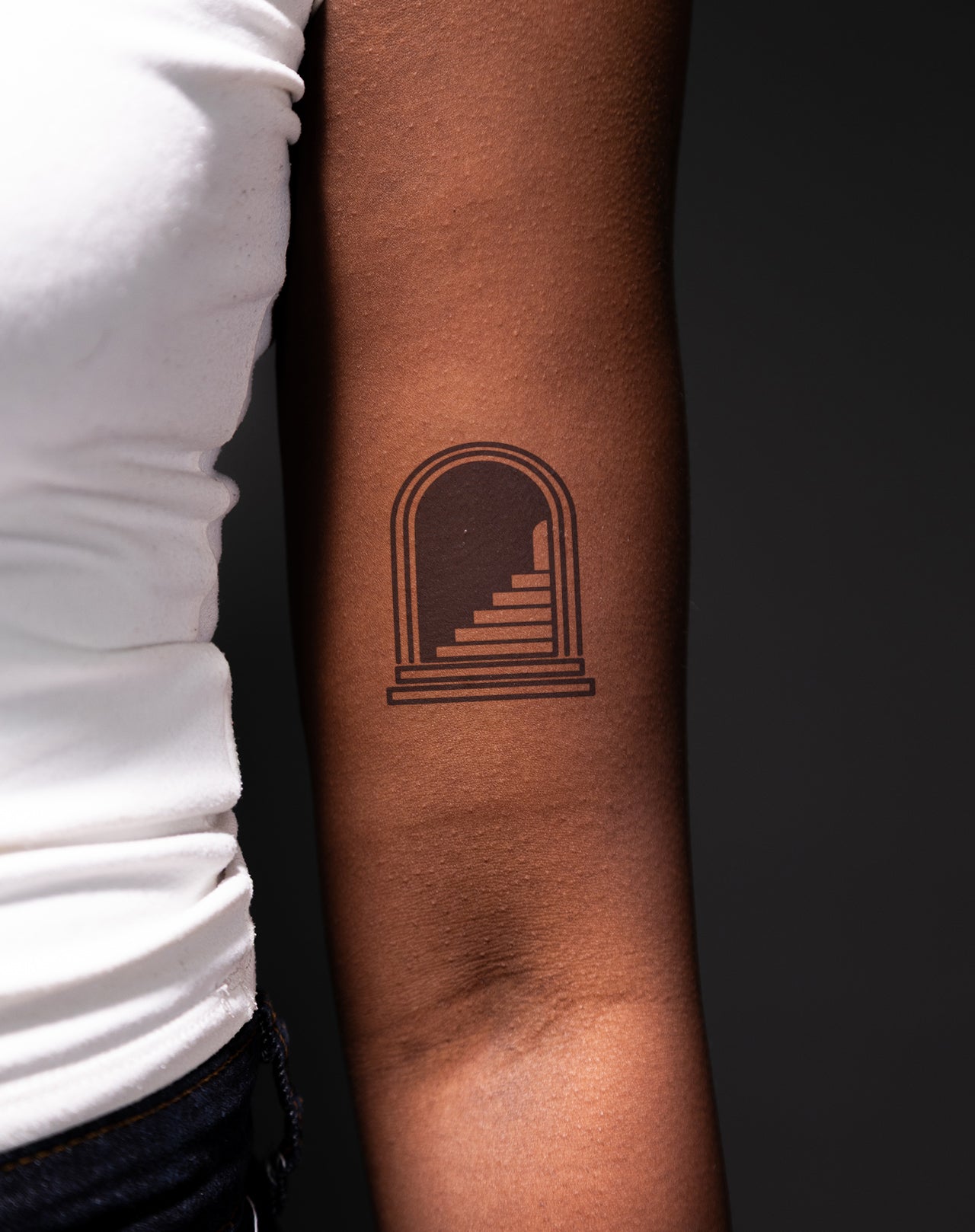 Heaven's Path - a perfect mini masterpiece for expressing yourself! This small semi permanent tattoo will bring a timeless look to your body with a 2x3 inch paperback featuring an archway and a stairway in a beautiful and minimalistic style. Make a bold and inspiring statement with this stunning design!