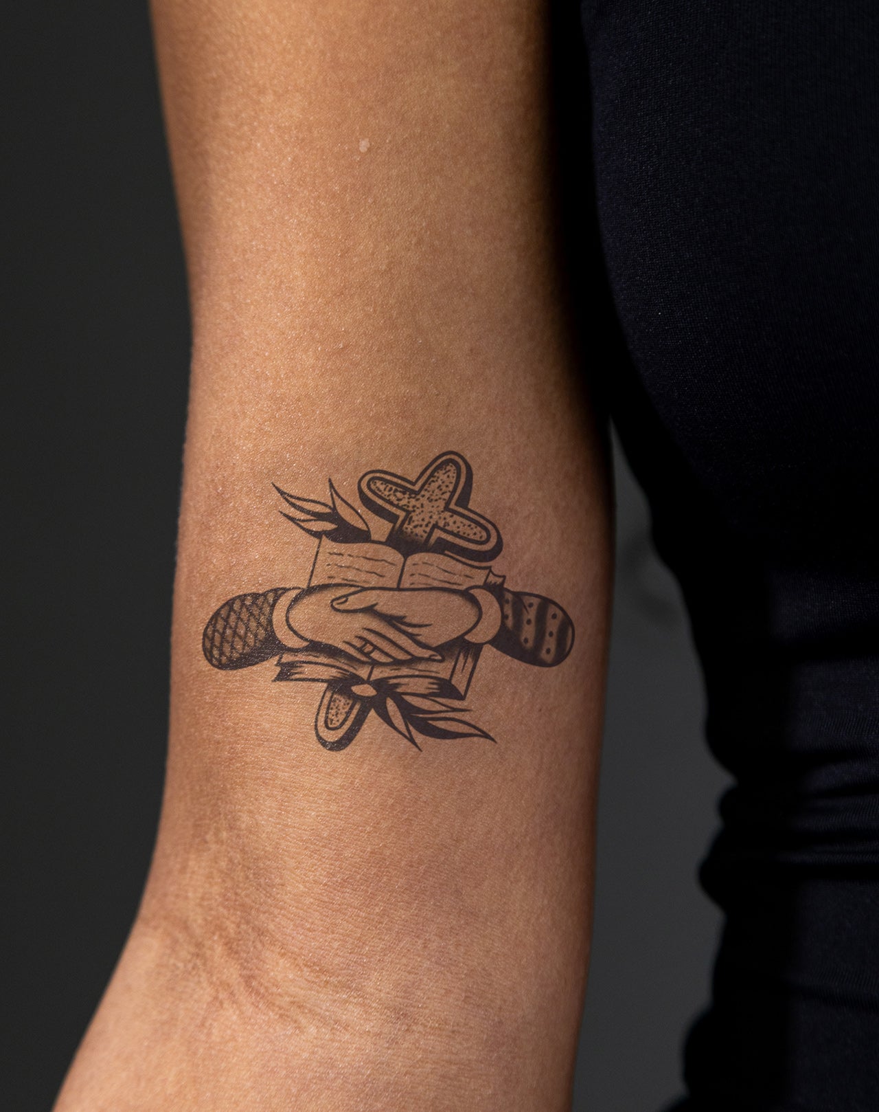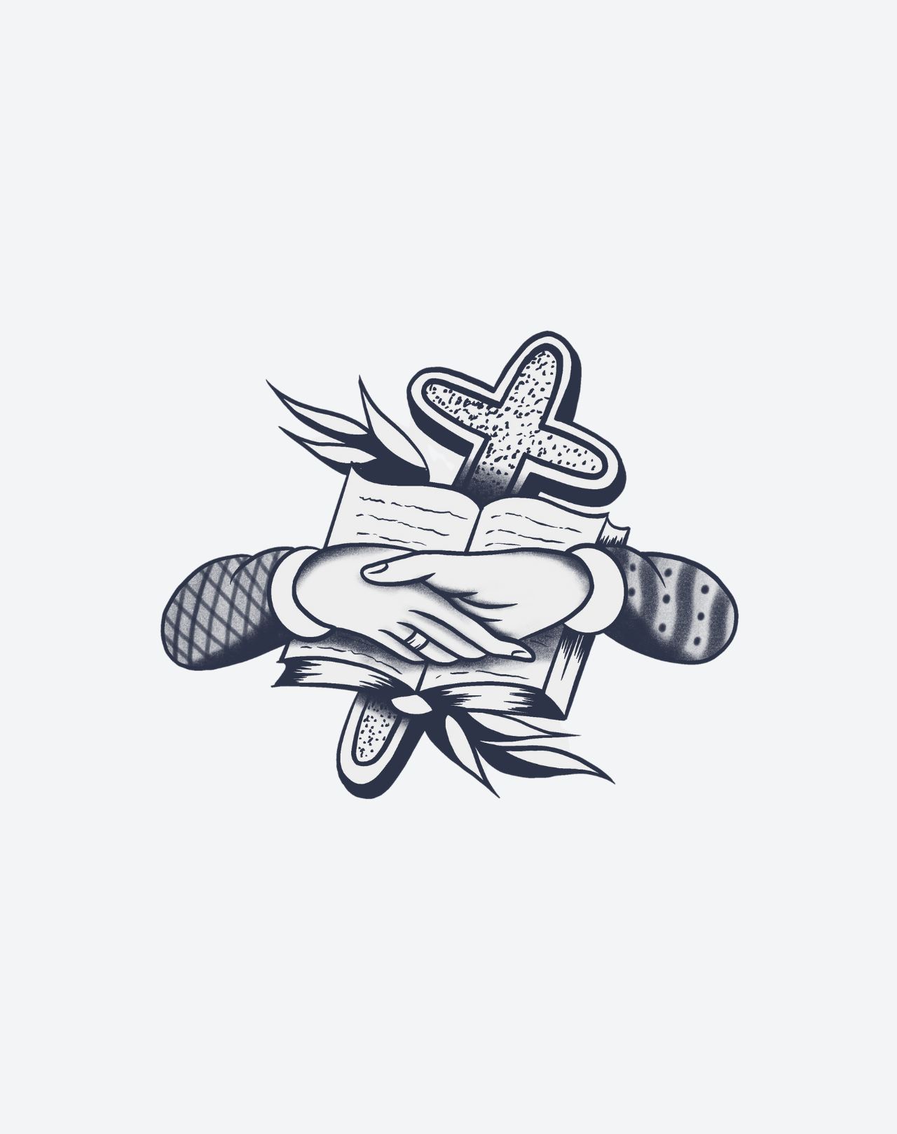 Holding Faith is a 2x4 inch design by @aaronfhc that portrays a pair of clasped hands resting on an open book, framed by bold leaves and a textured cross rising in the background. This emblem of devotion merges symbolism and tradition—faith held between palms, rooted in scripture, and uplifted by spiritual strength. With its clean contrast and timeless imagery, this EZINK temporary tattoo lasts 1–2 weeks, perfect for those carrying belief close to the heart.
