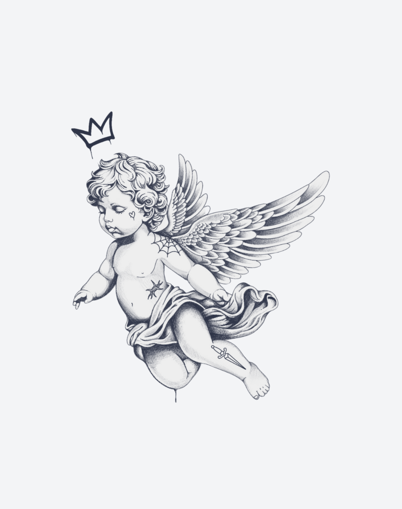 Inked Innocence is a 4x4 inch design by @brooketattoos, reimagining the classic cherub with a rebellious twist. Crowned above and detailed with miniature tattoos — from a heart and web to a tiny blade — this winged figure blends purity with edge. The 1–2 week EZINK temporary tattoo plays on the tension between innocence and defiance, making it a striking emblem for those who embrace contrasts and rewrite tradition in their own style.