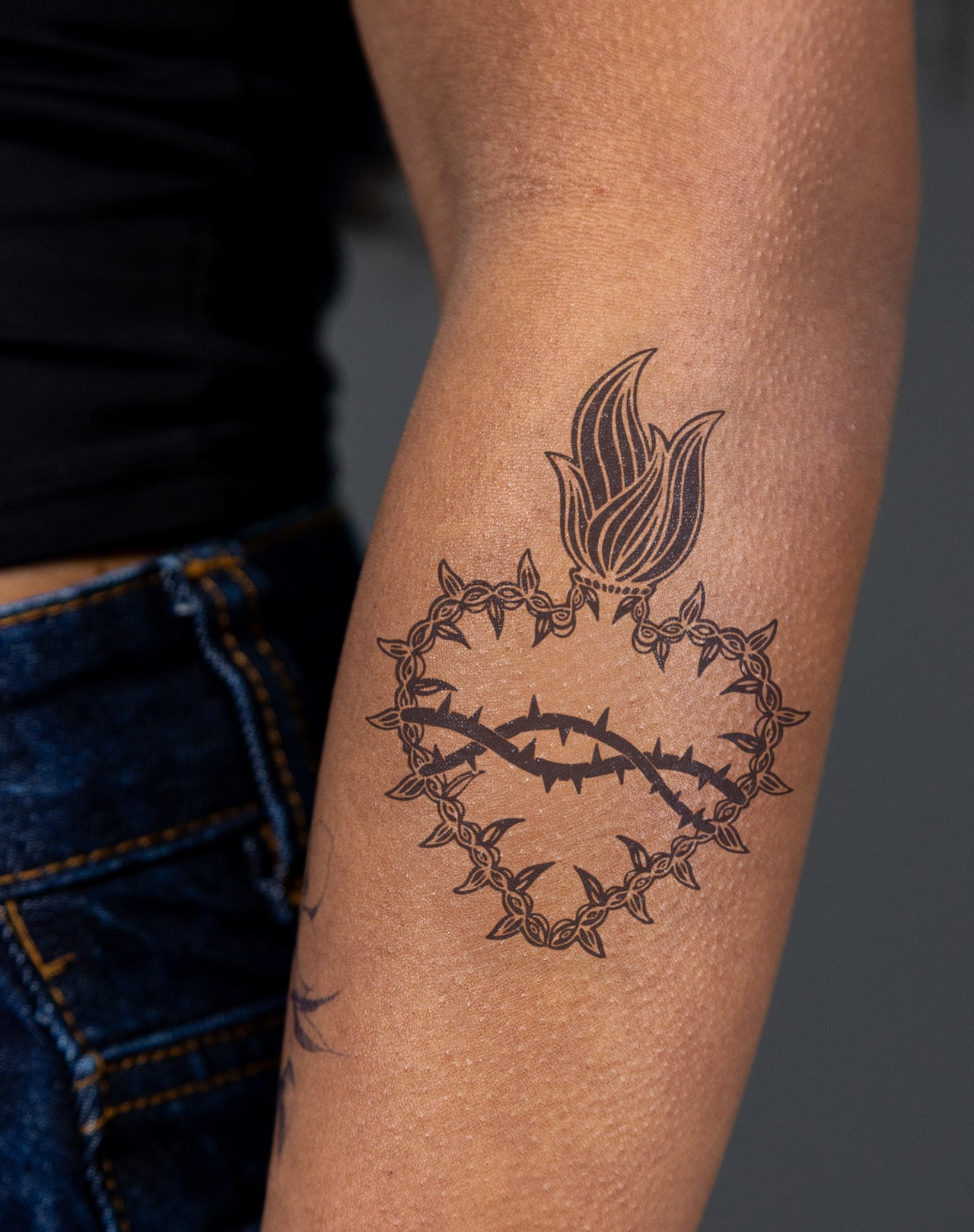 Transform your skin into a canvas for self-expression with the Inverted Heart temporary tattoo by llims.art. This 4x4 inch EZINK design features a sacred heart, lasting 1-2 weeks for a unique statement. Show off your passion and creativity with this bold and beautiful tattoo.