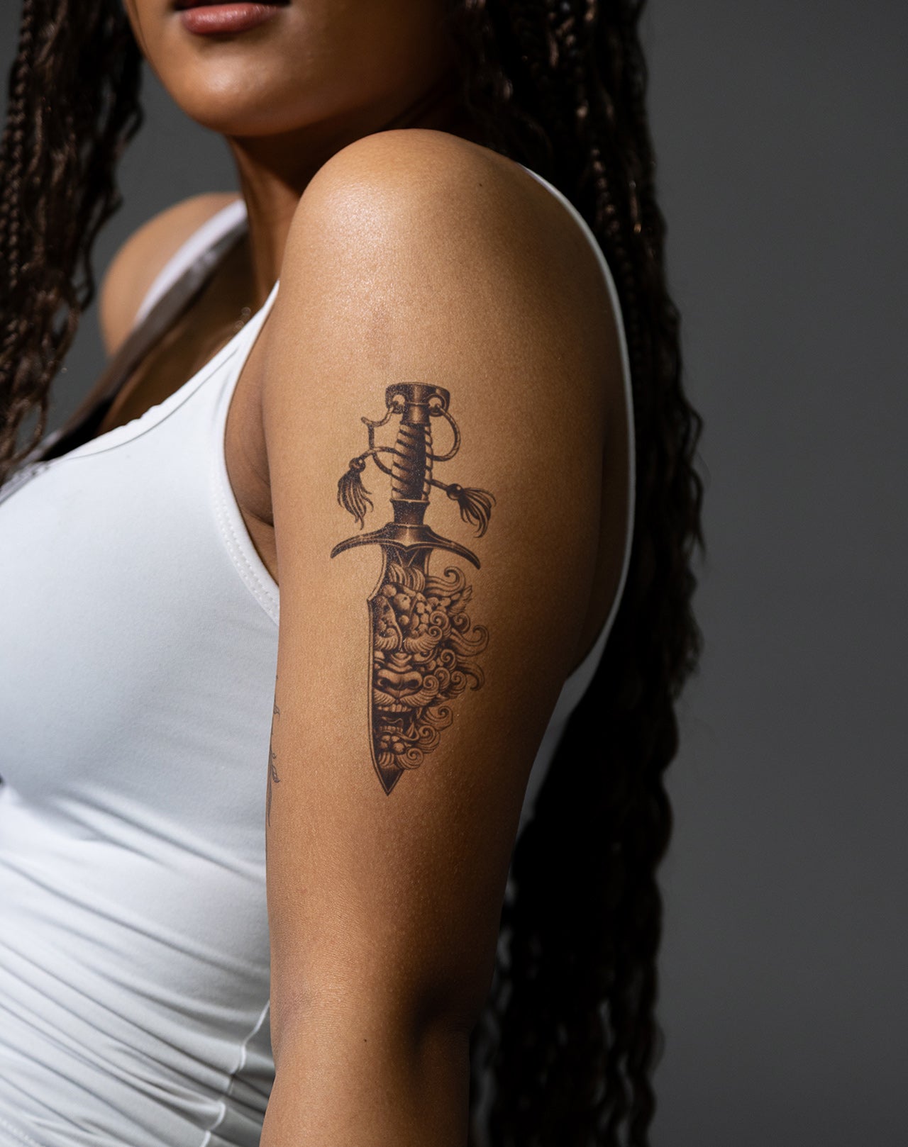 Experience the artistry and craftsmanship of Japanese daggers with this 3x6" semi-permanent tattoo. Enjoy up to two weeks of eye-catching body art without the commitment of permanent ink. Experiment with different styles and placements in a fun and affordable way.