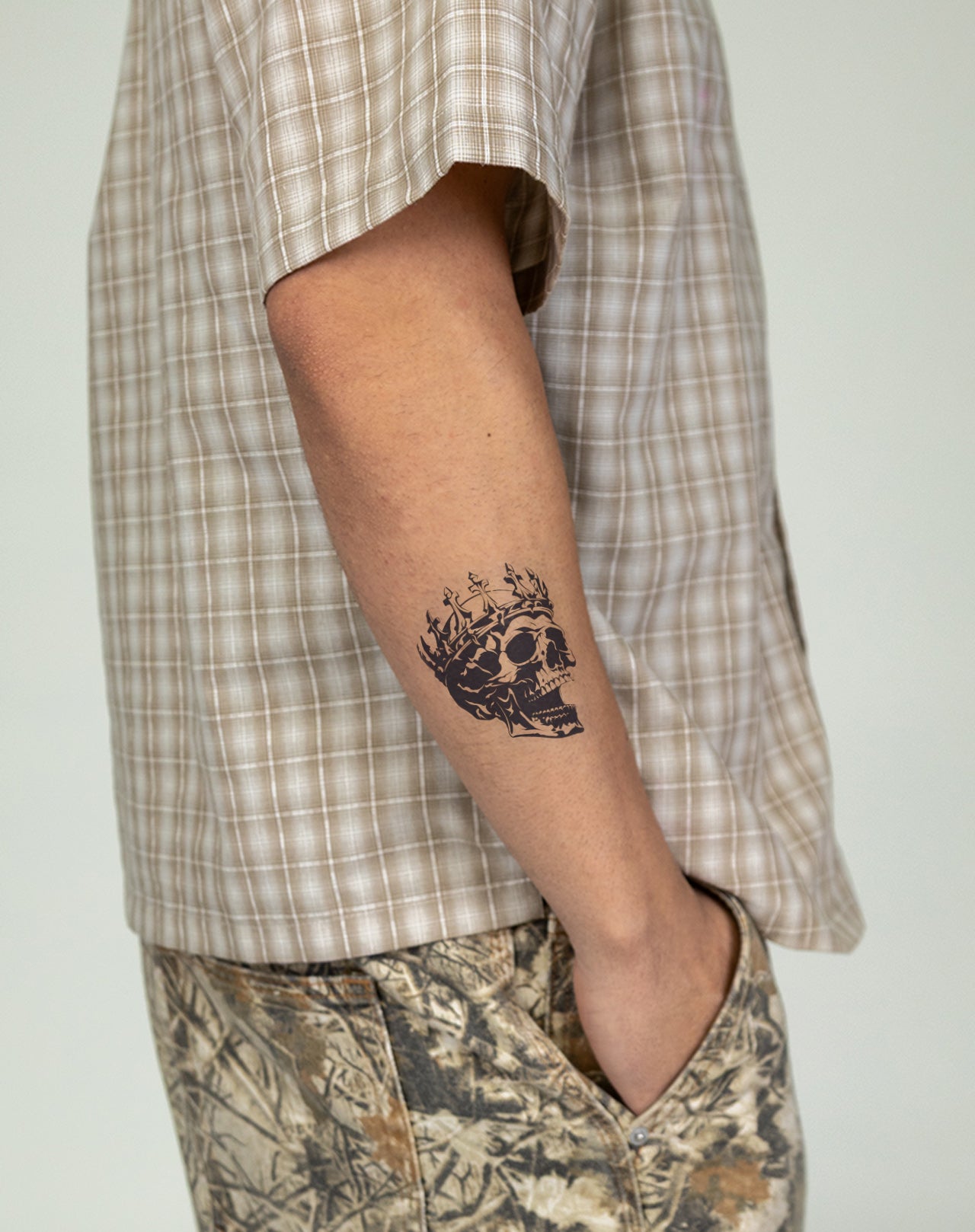 Bring out your inner rebel with the King of the Underworld temporary tattoo! This 4x4 inch EZINK design, created by mahlo_tattoo, features a skull wearing a crown. With long-lasting wear of 1-2 weeks, you can showcase your unique style and passion for edgy fashion.