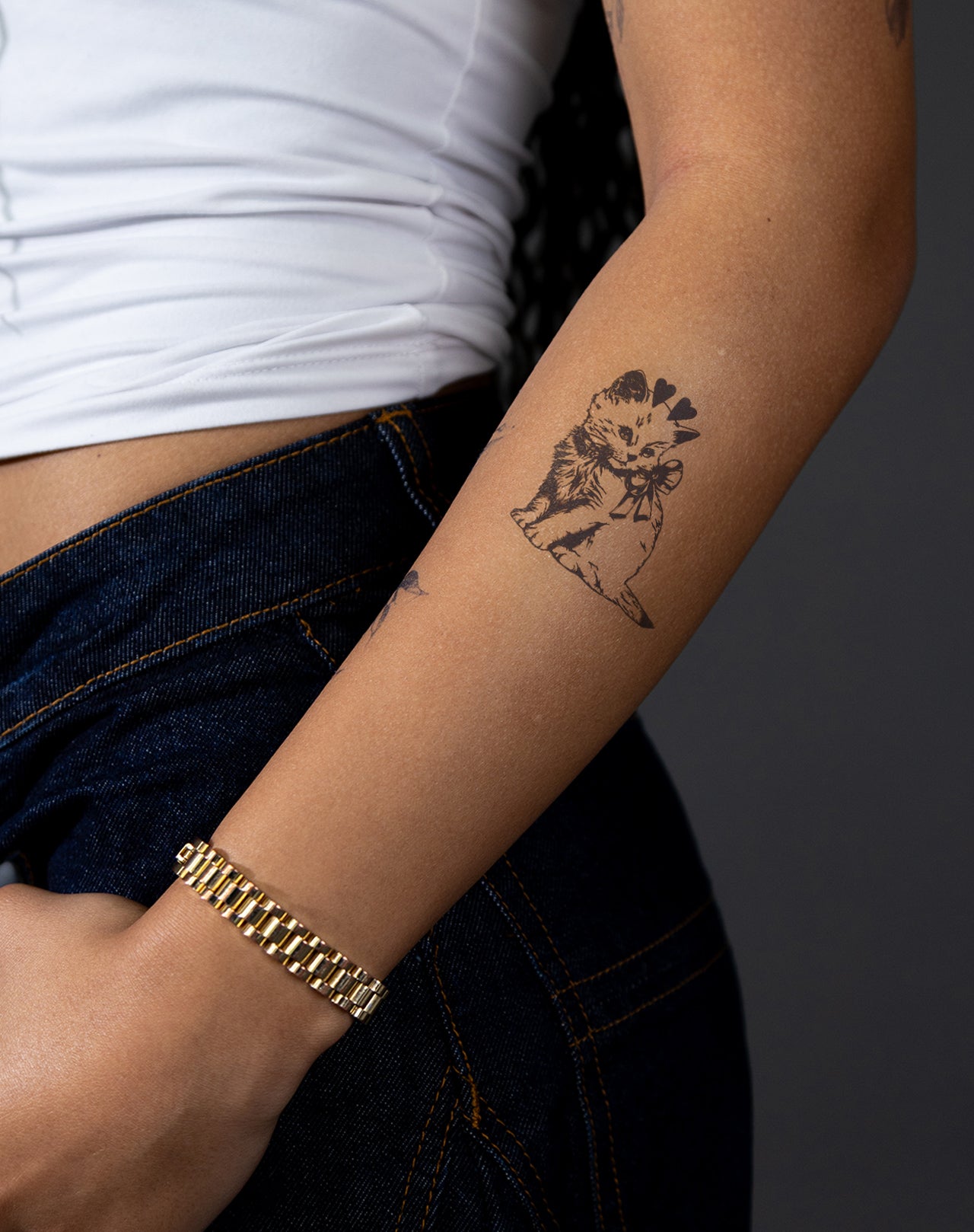 Experience the cuteness overload with Kitten Love temporary tattoo! This 2x3 inch EZINK tattoo lasts 1-2 weeks and features a design of an adorable kitten with a bow and two hearts on its head. Show off your love for cats in a unique and fun way. Order yours today!