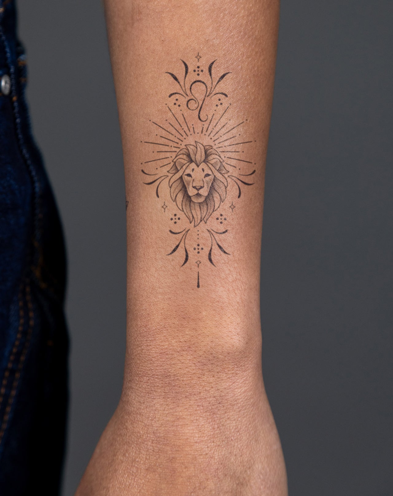 Leo Love is a 3x6 inch design by @sandra.o.tattoo, embodying the fierce and regal energy of the Leo zodiac. The lion, a symbol of power, strength, and leadership, takes center stage with its majestic mane and confident expression. Radiating from its mane are delicate, celestial rays that emphasize Leo’s commanding presence, while subtle cosmic symbols and elegant floral flourishes add depth and refinement to the design. Perfect for those who embrace their inner lion, this tattoo captures the fiery passion and royal demeanor of the Leo spirit. Delivered as an EZINK temporary tattoo, it lasts 1-2 weeks, offering a glimpse into the heart of the zodiac's boldest sign.