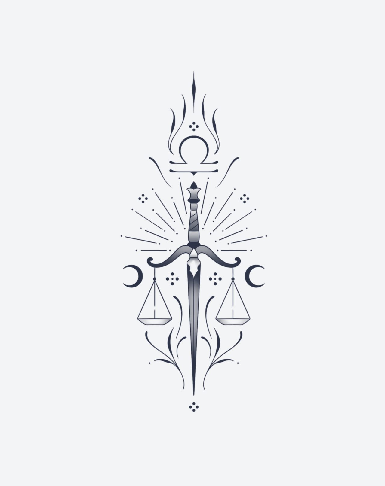 Libra Lust is a 3x6 inch design by @sandra.o.tattoo, beautifully combining celestial and symbolic elements. At the heart of this design is the sword of justice, positioned between the scales of Libra, emphasizing the balance and harmony this zodiac sign represents. The intricate detailing of the sword's hilt, paired with flowing ornamental flourishes, radiates strength and poise. The balance scales, symbolizing fairness and equilibrium, are framed by delicate lines and subtle starbursts that convey a sense of cosmic alignment. This design serves as a bold yet elegant tribute to those born under the Libra sign, with its graceful yet powerful aesthetic, making it a perfect temporary tattoo for those seeking both beauty and balance. It lasts 1–2 weeks when applied as an EZINK tattoo.