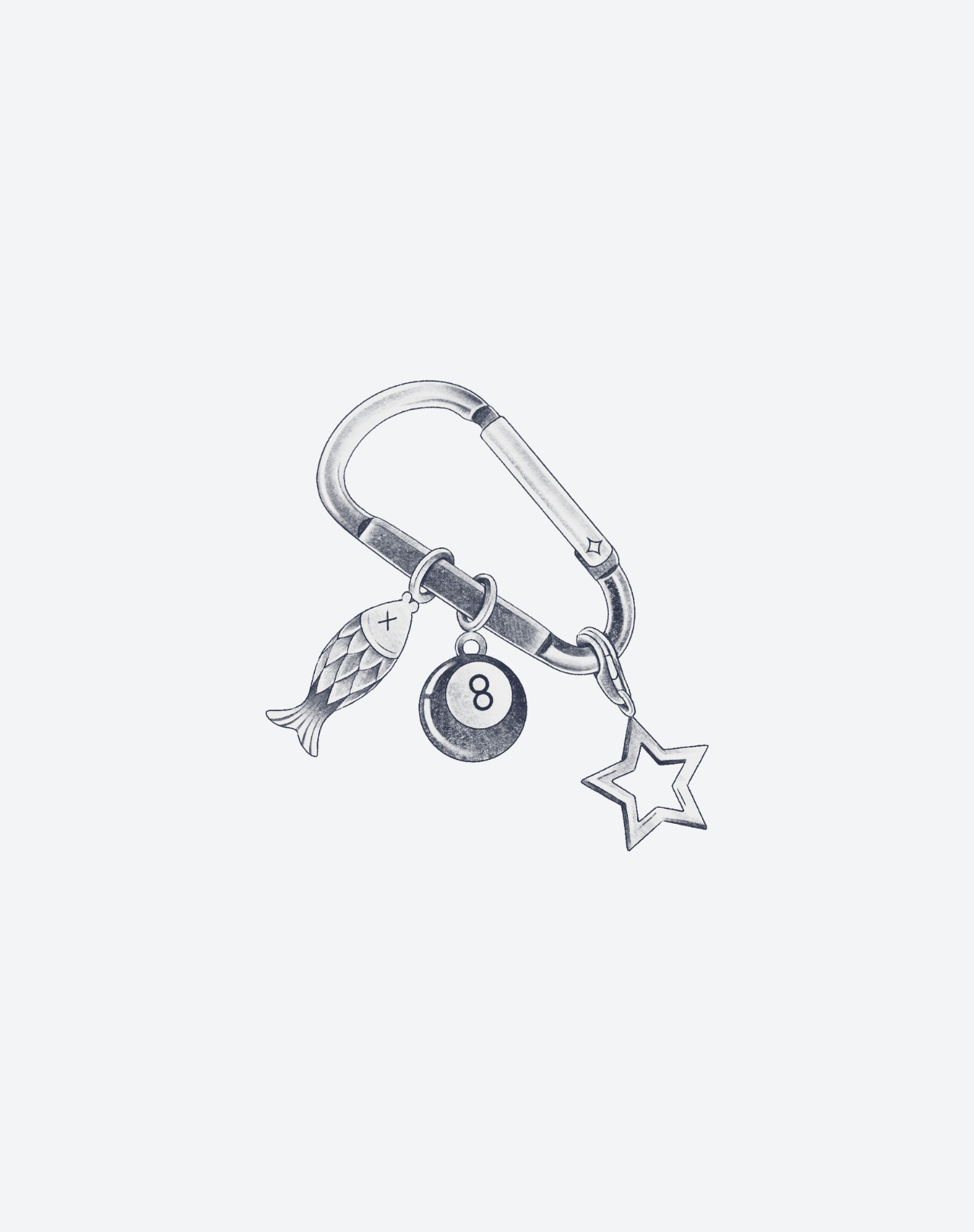 Lucky Charms is a 2x3 inch design by @amberpokes that captures playful mystique in miniature. A carabiner acts as the anchor for an eclectic trio: a stitched-up fish, a gleaming 8-ball, and a hollow star charm. Each symbol hints at luck, fate, and superstition—an enchanting homage to the tokens we carry for meaning and protection. Delivered as a 1–2 week EZINK temporary tattoo.