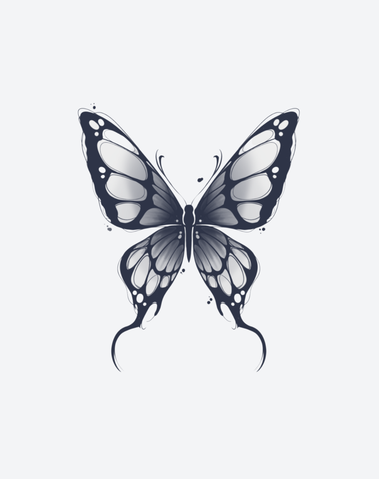 Nightwing is a sleek 4x4 inch design where elegance flutters with a dark edge. This symmetrical butterfly spreads its bold, gradient wings in high-contrast black and silver tones—each curve and dot refined with shadowed grace. Created by @kirsten.tattoo, this EZINK temporary tattoo lasts 1–2 weeks, perfect for those drawn to transformation, symmetry, and the quiet power of night.