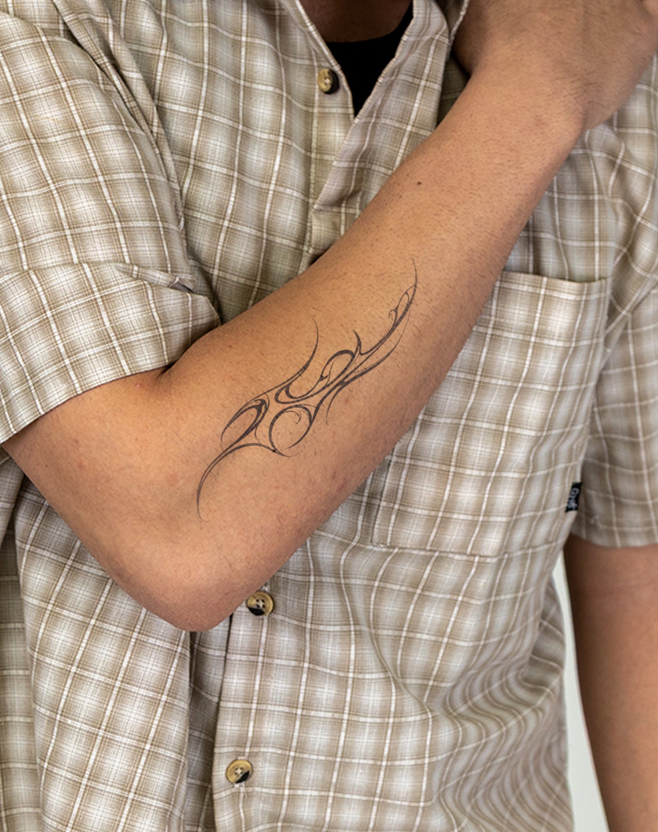 Nubular is a 3x6 inch design by @lorrainy.tatts that channels raw energy into sharp, fluid motion. With its interwoven arcs and flames, the design flows like smoke and steel—organic yet mechanical, primal yet futuristic. Its symmetry carries the power of tribal markings while its sleek edges nod to modern minimalism. This 1–2 week EZINK temporary tattoo is a mark for those who live at the edge of chaos and control, embodying momentum, strength, and untamed spirit.