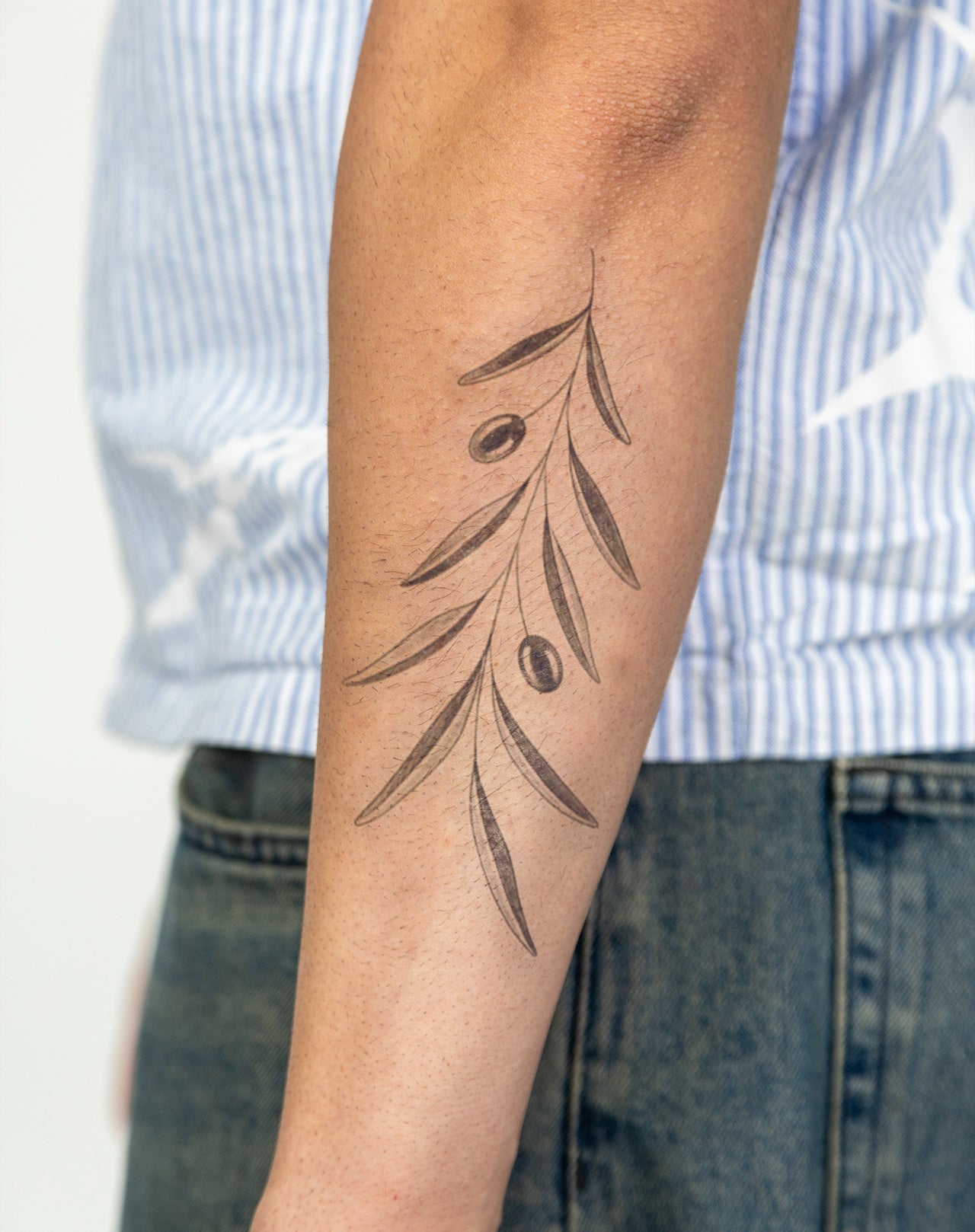 Olive Branch is a 3x6 inch design by @amberpokes that channels peace, growth, and quiet strength. With its slender leaves and ripened olives flowing gently along a curved stem, this tattoo evokes timeless serenity and resilience. Ideal for those who seek harmony and a grounded presence. Delivered as a 1–2 week EZINK temporary tattoo.