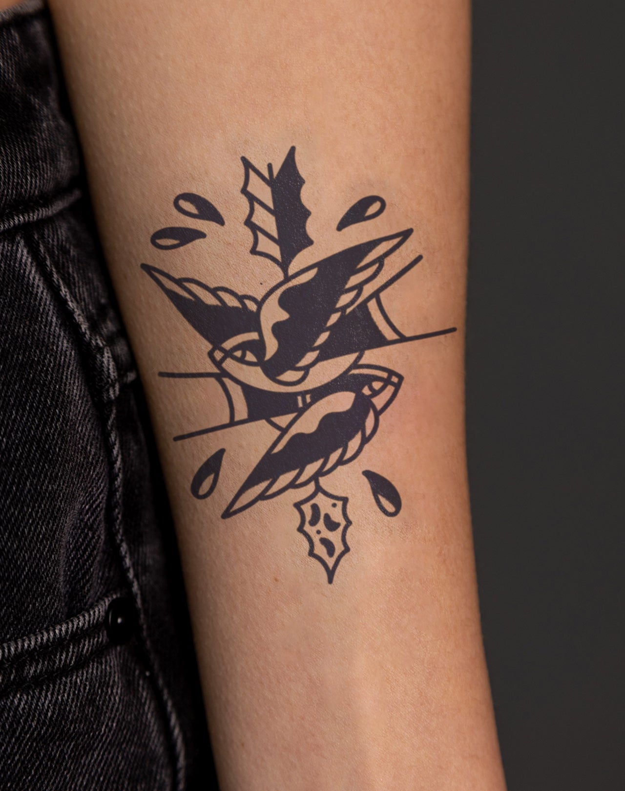 Pierce the Sky is a 3x6 inch design by @emmypokes that captures motion, strength, and heart in a single bold stroke. A swallow takes flight through an arrow’s path, its wings unfurled in fearless ascent. The sharp lines and deliberate shading nod to the golden age of tattoo artistry—where each mark told a story of courage and return. Traditionally, swallows symbolize loyalty and safe passage; here, entwined with the arrow, they embody the will to keep moving forward despite the wound. This 1–2 week EZINK temporary tattoo rests beautifully along the collarbone, ribcage, or forearm—an emblem of resilience, hope, and the grace of persistence.