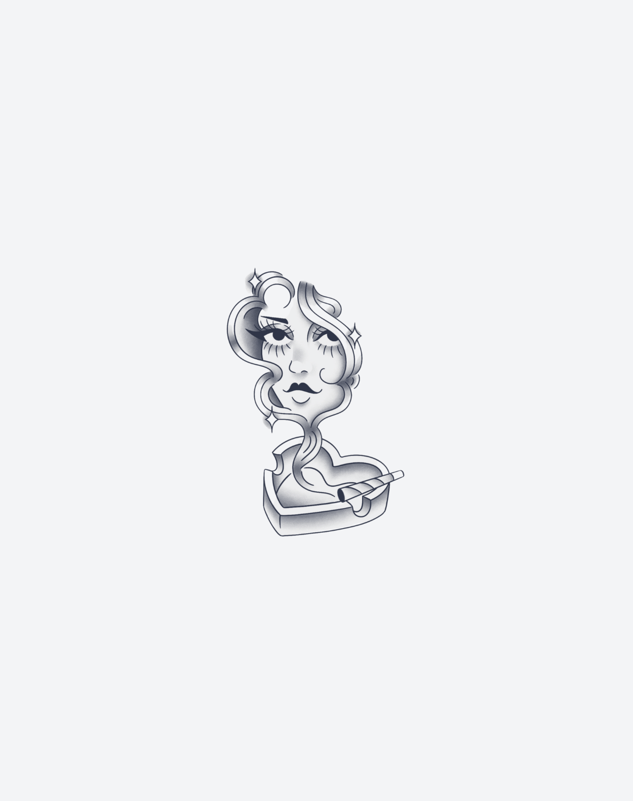 Puff & Pout is a 3x6 inch design by @madeye.ink that captures retro flair with a playful twist. A bold-lined face emerges in soft curves, framed by stylized smoke and sparkling highlights, while a cigarette dangles with effortless attitude. Mixing classic tattoo iconography with surreal exaggeration, the piece symbolizes rebellion, indulgence, and unapologetic self-expression. With smooth shading and sharp detail, it carries both charm and edge. This 1–2 week EZINK temporary tattoo’s vertical design makes it ideal for the arm, calf, or side torso—serving as a reminder to embrace confidence without compromise.
