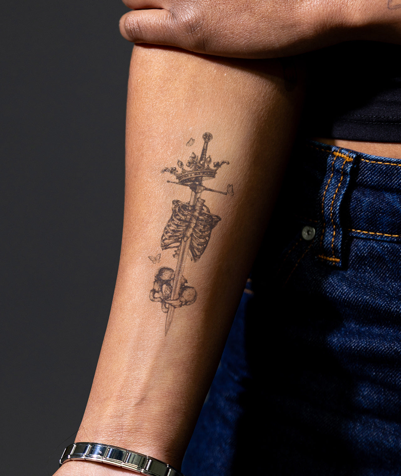 Regal Ruin is a 2x4 inch design by @punchy.trent that symbolizes power, mortality, and the beauty found in decay. The artwork depicts a crowned sword piercing through a ribcage entwined with bones, surrounded by delicate butterflies—a contrast between dominance and fragility. Rendered in Trent’s precise and expressive style, Regal Ruin captures the poetic tension between strength and surrender. This 1–2 week EZINK temporary tattoo stands as a reminder that even in ruin, there is grace—and within every ending, the echo of rebirth.