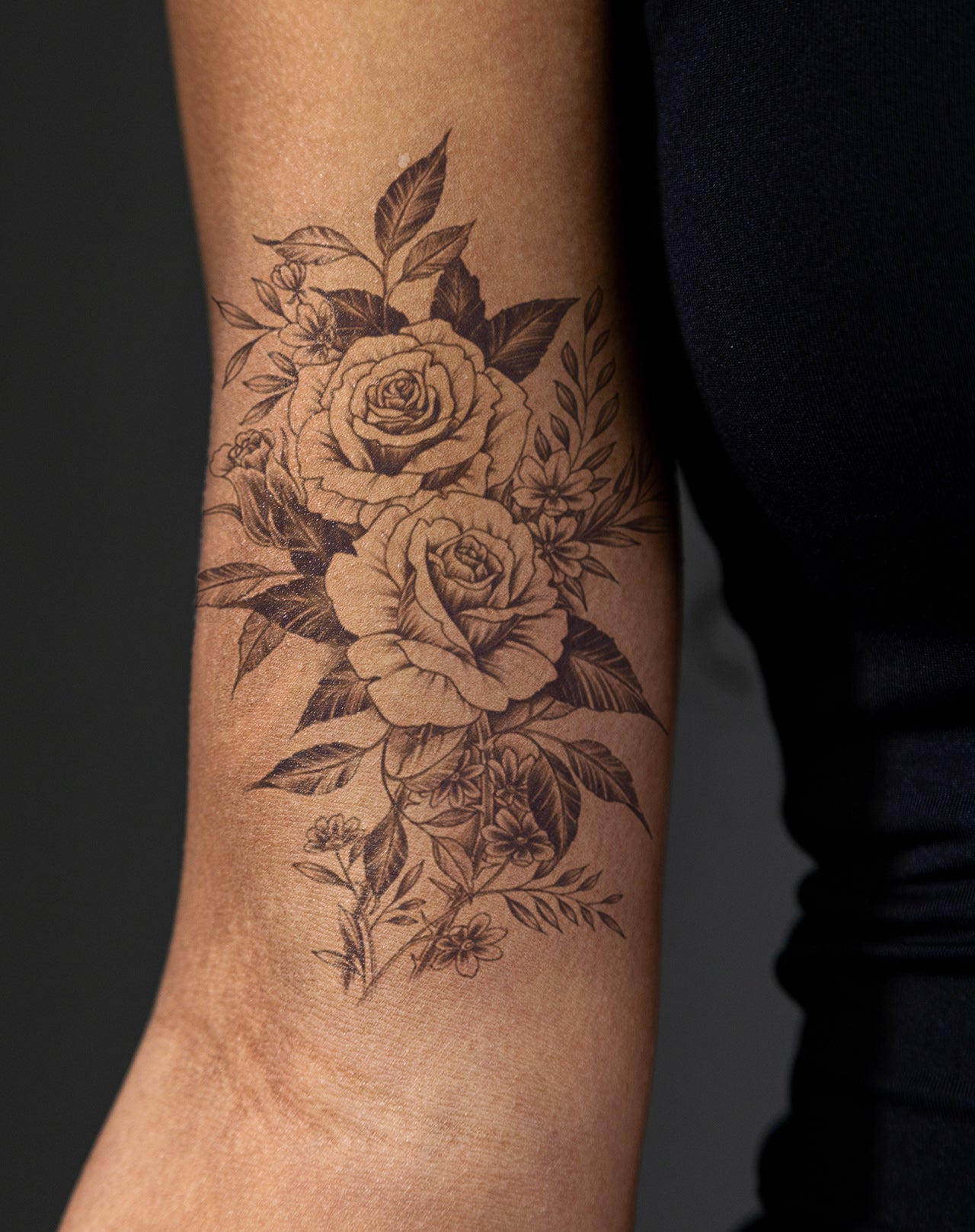 Look and feel beautiful with Rosey Bunch! This 4x7" semi-permanent tattoo will enhance your look with a stunning and intricate bouquet of roses that'll last up to 14 days. Feel confident with a captivating and vibrant tattoo that'll leave you looking and feeling ready for whatever life throws your way!