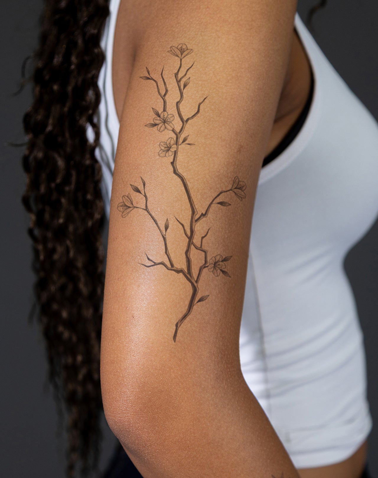 Spring Whisper is a 5.5x9 inch design by @sandra.o.tattoo that captures the delicate elegance of nature's quiet bloom. A slender branch winds with subtle bends, adorned by gentle blossoms and unfurling leaves, evoking serenity and renewal. Ideal for those drawn to ephemeral beauty and the still strength of growth. Delivered as a 1–2 week EZINK temporary tattoo.