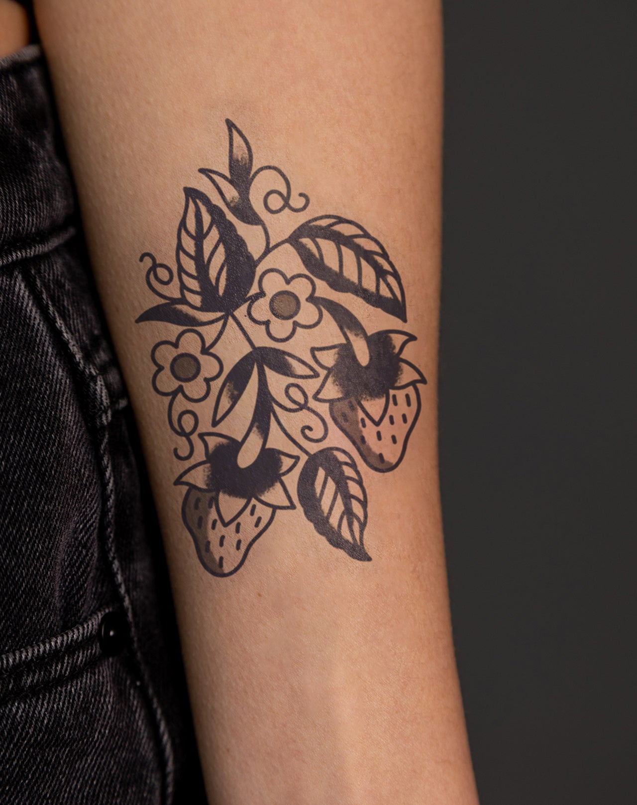Strawberry Sweetheart is a 3x6 inch design by @emmypokes that captures tenderness through timeless form. A pair of ripe strawberries hang among blooming flowers and curling vines, their bold outlines and soft details a nod to classic tattoo craftsmanship. Each stroke balances sweetness with strength—an emblem of love, abundance, and the quiet beauty of care. Rooted in tradition yet rich with personality, this design carries the easy charm of vintage flash art. This 1–2 week EZINK temporary tattoo sits naturally on the shoulder, hip, or forearm—an ode to affection that endures, season after season.