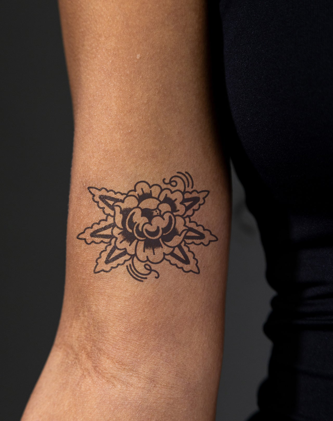 Studio Botanica is a 4x4 inch design by @emmypokes that honors the timeless language of traditional tattoo florals. A single bold bloom anchors the composition—petals unfurling in symmetry, leaves framing it in steady rhythm. With its clean lines and rich, dark shading, the design recalls the craft and clarity of classic flash, where every stroke carries intention. Both resilient and romantic, it speaks to artistry that grows through discipline and care. This 1–2 week EZINK temporary tattoo lays beautifully across the sternum, shoulder, or back of the hand—a quiet tribute to creative roots and the enduring beauty of bold expression.