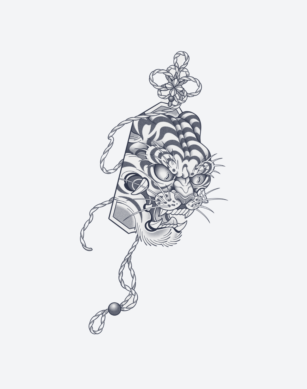 Tiger’s Blessing is a 4x7 inch design by @madeye.ink that channels raw power and sacred protection. Emerging from an omamori charm, the tiger’s fierce gaze and bold stripes are framed by intricate ropework, blending strength with tradition. This striking composition symbolizes courage, resilience, and the guardianship of spirit, offering both ferocity and fortune in its form. With layered shading and dynamic detail, the piece carries an aura of ritual and reverence. This 1–2 week EZINK temporary tattoo’s elongated design makes it perfect for placement on the forearm, thigh, or back—serving as a reminder of strength safeguarded by timeless symbols.