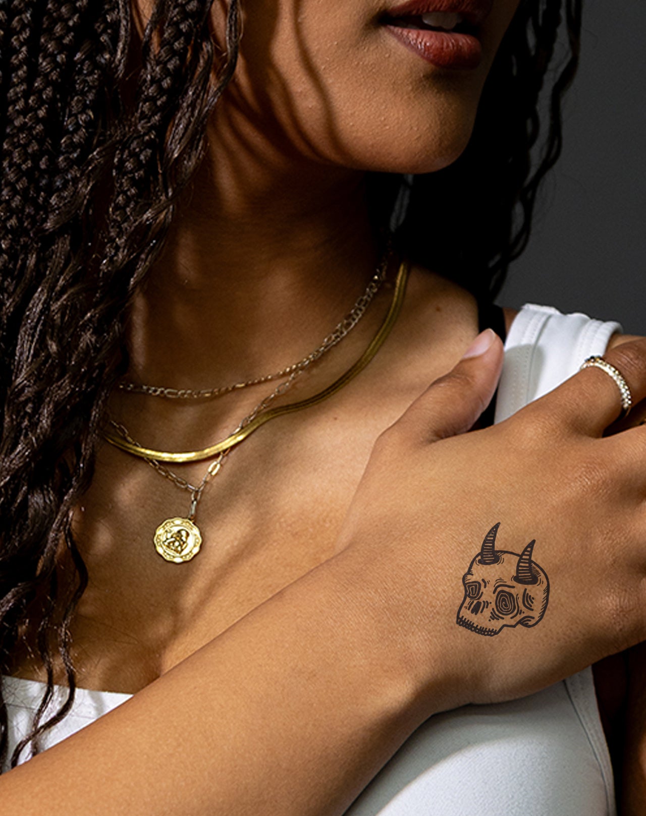 Transform your look with the Trippy Skull EZINK temporary tattoo! Measuring 2x2 inches, this tattoo features a hypnotic skull design with swirling eyes and horns. Lasting 1-2 weeks, it's the perfect way to express your edgy style without the commitment of a permanent tattoo. Experience a new level of coolness.