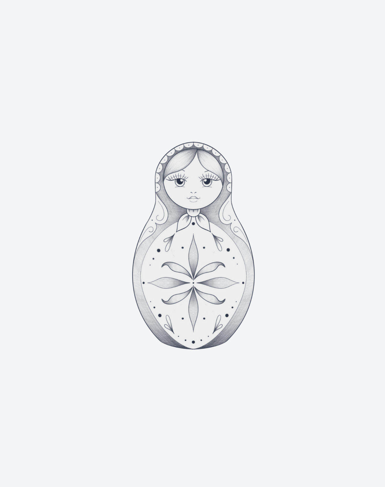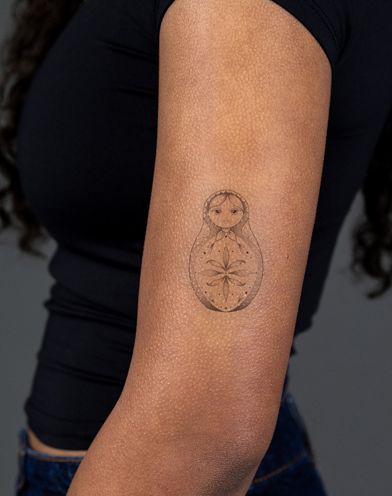 Babushka is a 2x3 inch design by @shelltatts that brings to life the timeless charm of the matryoshka doll. With delicate floral motifs and soft shading, this tattoo captures the warmth, mystery, and layered identity of tradition. A sweet yet symbolic piece for those who carry their heritage close. Delivered as a 1–2 week EZINK temporary tattoo.