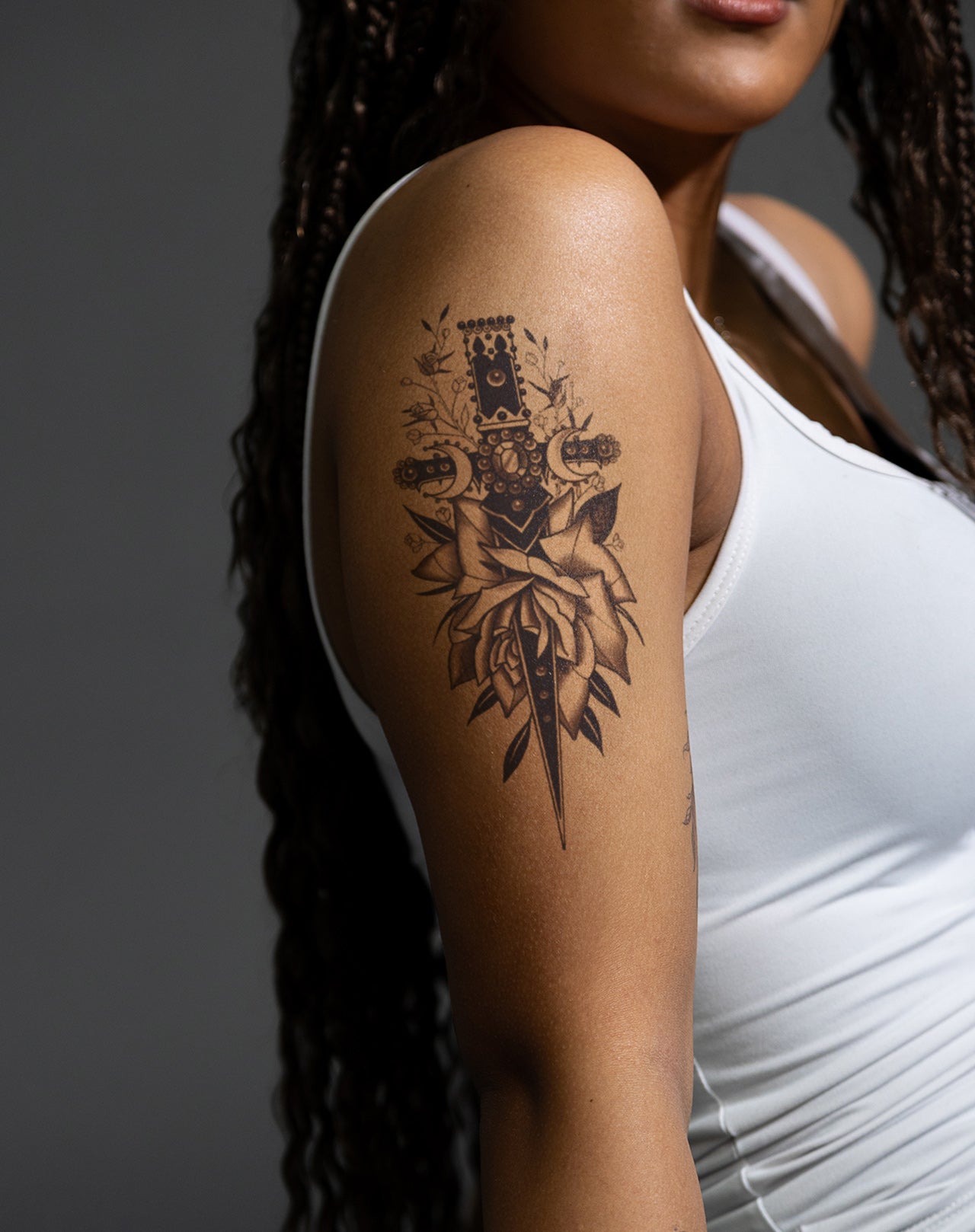 Embrace elegance with an edge with our Jeweled Dagger temporary tattoo! This 4x7-inch design features a realistic jeweled dagger piercing through a delicate rose, symbolizing beauty and strength. Lasts 1-2 weeks, perfect for testing your bold and sophisticated style before committing to a permanent tattoo.