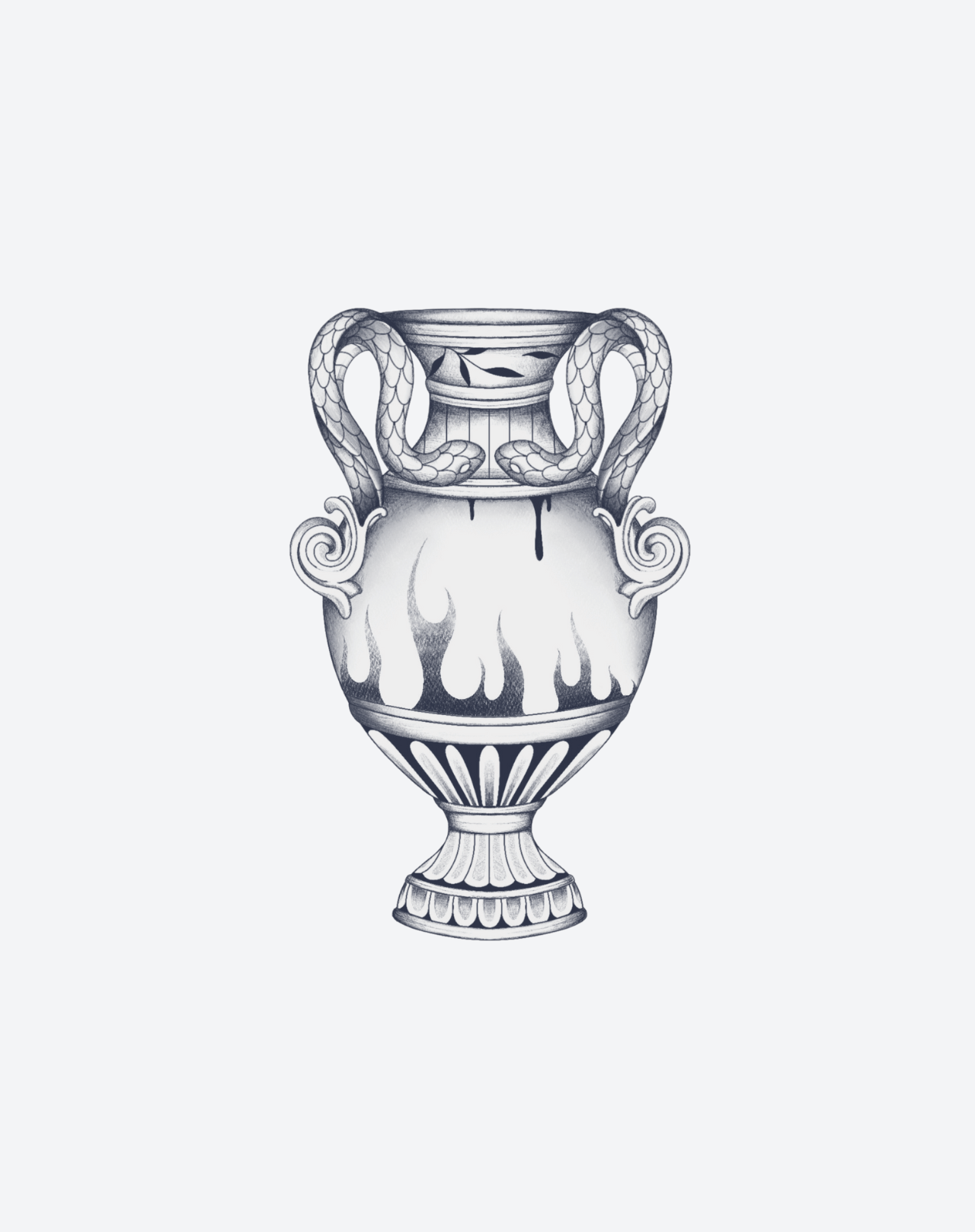 Vessel of Venom is a 2x3 inch design by @brooketattoos, featuring a classical urn wrapped with twin serpents and crowned with subtle flames. The imagery speaks to temptation, danger, and hidden power, as the vessel appears to hold both beauty and peril within its form. With bold linework and timeless symbolism, this 1–2 week EZINK temporary tattoo embodies the duality of creation and destruction.